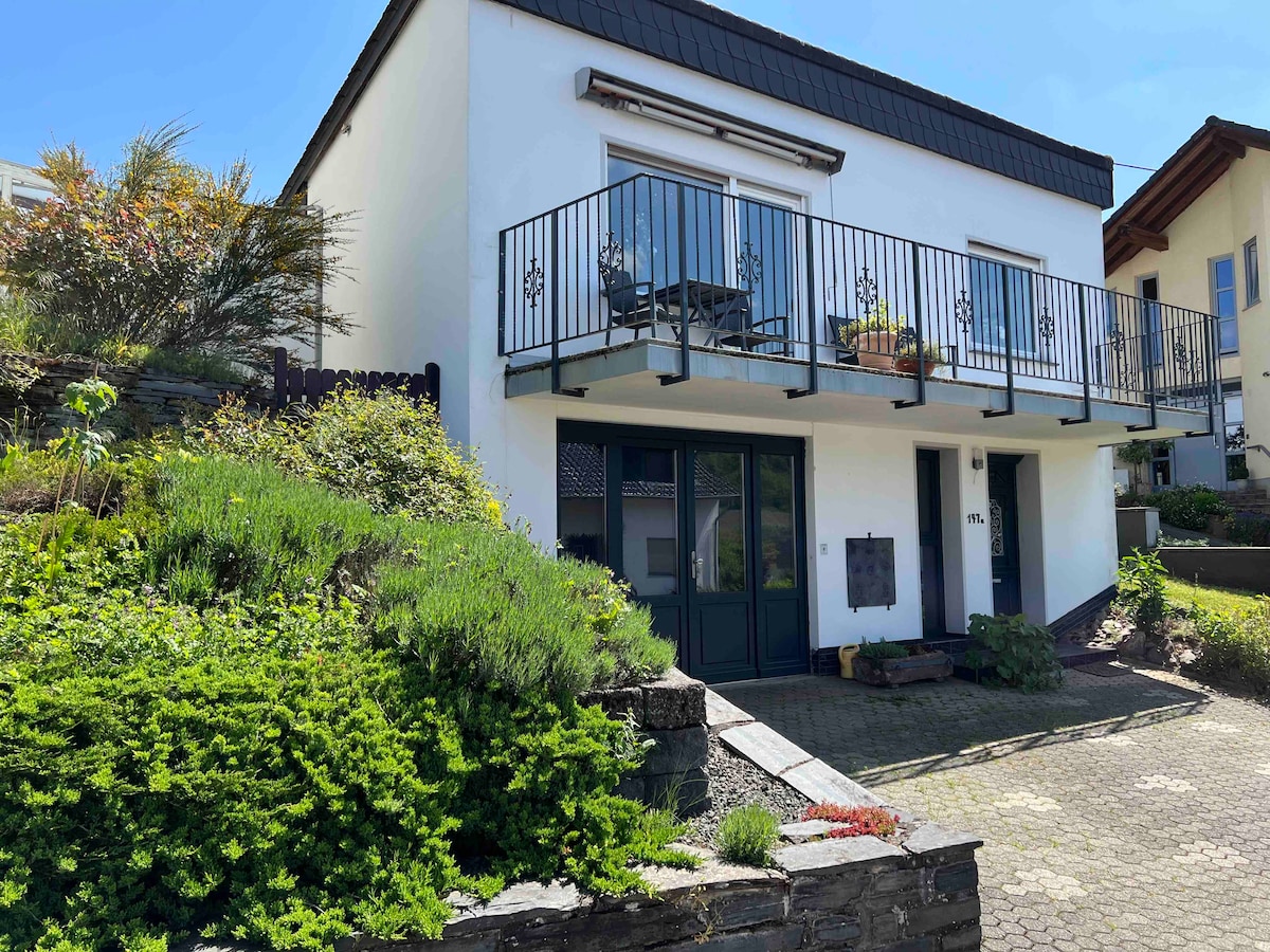Our stylish cottage is situated in the charming wine village Wiltingen. From the spacious living room and the balcony you have a beautiful view on the Altenberg. The large garden overlooks the village and the surrounding vineyards and is great for all sorts of activities. Enjoy a meal from the grill, relax in the hammock between the apple trees and at the end of the day watch the sunset with a cool Riesling wine. The Riesling-grapes grow right behind the garden gate.