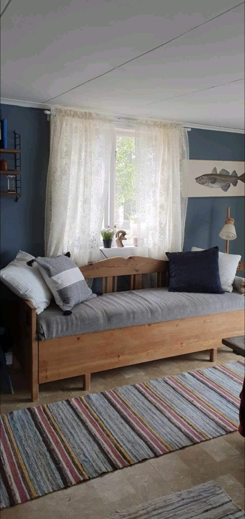 Bo lugnt och centralt i änden på denna återvändsgata. Härligt boende i litet hus på 60 kvm med öppen planlösning och högt i tak. Huset har ett sovrum med dubbelsäng 160 cm. I allrummet finns en bekväm bäddsoffa 160 cm. Möjlighet finns att elda i den lilla kaminen. Sängkläder och handdukar ingår och du bäddar din säng själv. Tvättmaskin, strykjärn och strykbräda finns. Självincheckning via nyckelbox med kod vid entrédörr. Hyresvärdarna bor i huset bredvid. Den som bokar är den som övernattar.