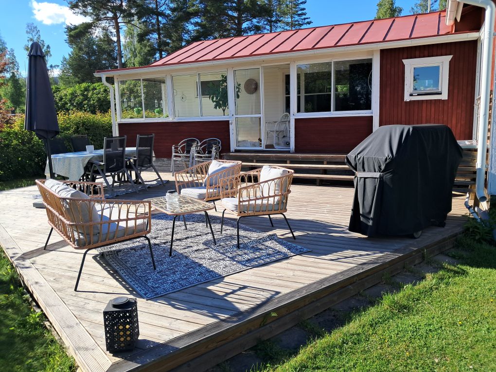 Cozy small villa with a large patio, view over river and hills. 200m to restaurant. Spacious rooms for family and friends. Permanent living standard with fully equipped kitchen. Separate shower area with sauna. Child-friendly backyard and peaceful forest next door that invites exploring. Experience outdoor activities, hikes and relaxation. 800m to the beach at Kyrkviken with a fantastic view of Halsingland's blue hills. Only 20 min drive to Downhill, Golf Course, Alpine or Cross Country skiing