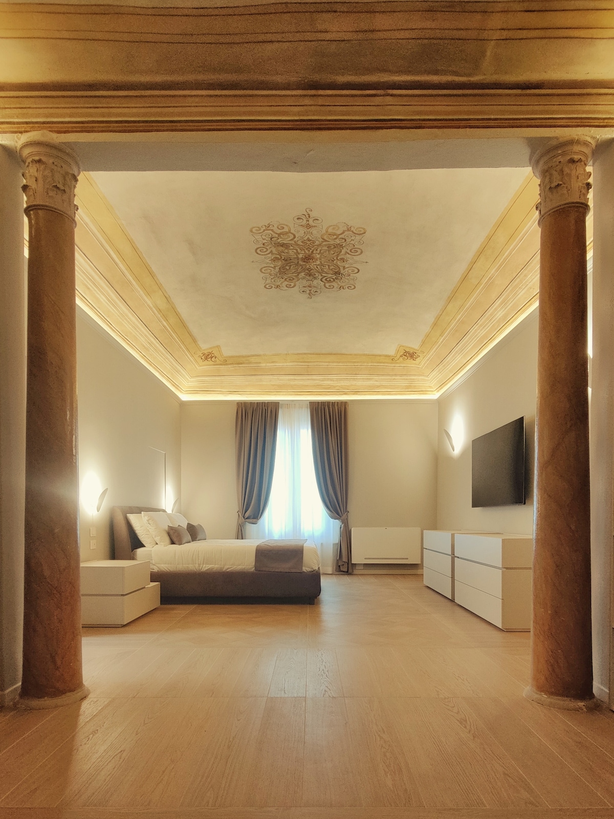 Benvenuti nel cuore storico di Bologna, dove l'eleganza si fonde con la storia in un appartamento unico nel suo genere situato in Piazza Roosevelt (200 metri da Piazza Maggiore). Questo affascinante appartamento, affrescato dai Fratelli Carracci, famosi artisti Bolognesi che si sono fatti apprezzare in tutto il mondo, vi offre non solo un luogo dove soggiornare, ma un'esperienza immersiva nella ricca storia e nella cultura di questa affascinante città.