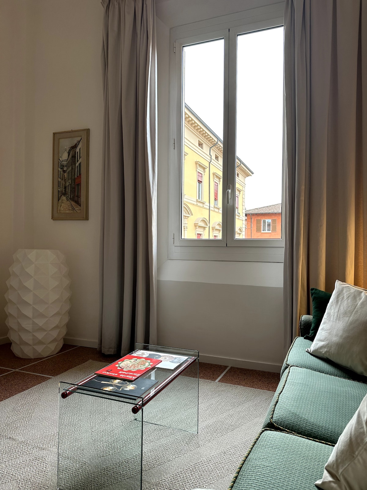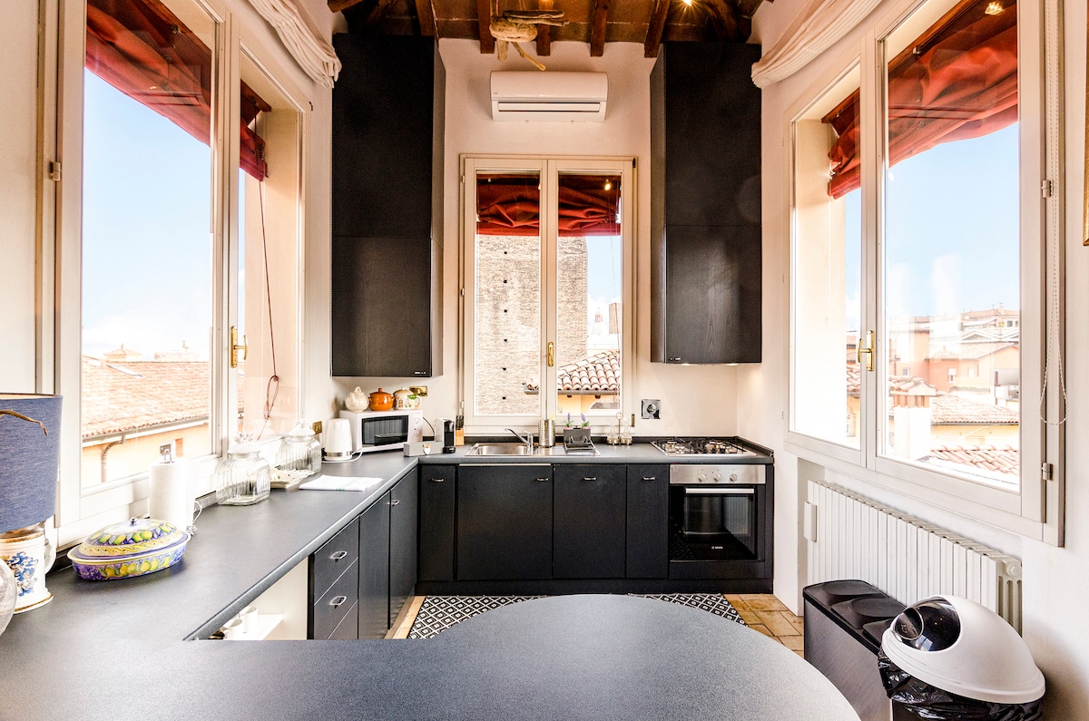 The apartment is situated on the top floor of an ancient building fitted with a glazed elevator in the heart of Medieval Bologna, right in front of the 17th-century Opera Theater. Cozy, panoramic and sunny, a quiet private loggia opens to the interior courtyards offering great views over rooftops, secular pine-trees, and the medieval Two Towers.