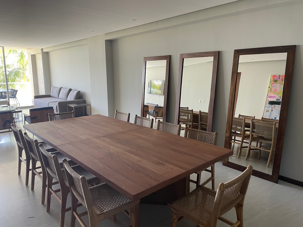Great speed WiFi reliable for working remotely, Cozy apartment in Sayulita downtown just 2 blocks away from the beach. 2 bedroom and 2 sofa beds, capacity 6 pax total. Garden area and large room with high ceilings giving a balance of luxury and comfort, for relaxation and tranquility. You can enjoy coffe shop, bars and restaurants to delight your palate just a few steps away, it includes air conditioning, automatic controlled access, parking space, incredible lounge pool.