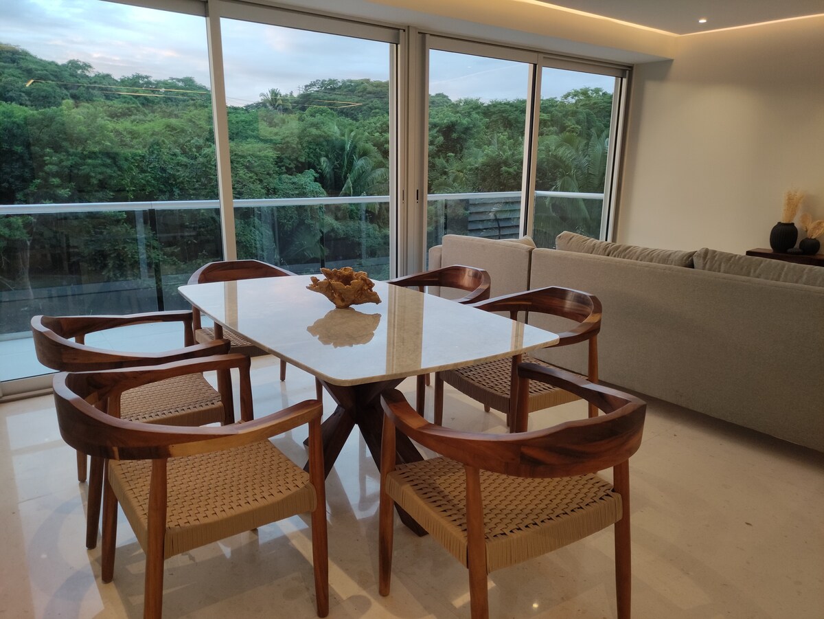Condo in Bolongo, Punta de Mita, surrounded by lush vegetation and a white-sand beach. Features two bedrooms—one with a king bed, the other with a double and a single—and offers views of the back of the complex. Enjoy natural shade from palms and manzanilla trees, plus world-class services in this exclusive destination. IMPORTANT: Resort fee of $100 MXN per person, payable directly at reception upon check-in, not included in the Airbnb payment.