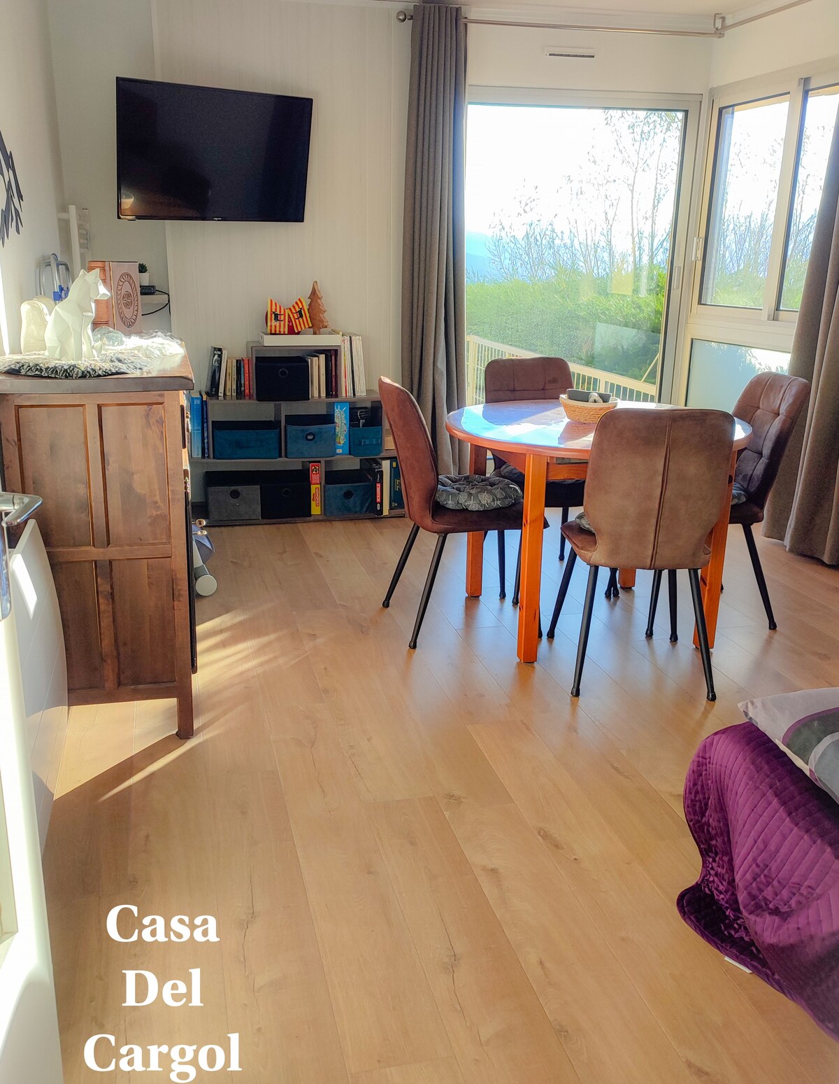Bonjour, Vous séjournerez dans un T3 style chalet, de 45m2, fraîchement rénové avec une vue imprenable sur la nature et les montagnes avoisinantes. Central a toutes commodités, vous y trouverez un balcon avec plancha et salon de jardin, un séjour avec cuisine ouverte, TV et canapé-lit 160cm, une chambre lit 140cm, une seconde chambre lit 140+90 et une salle de bain douche à l’italienne. Bon séjour et restant à votre disposition pour tout élément complémentaire. Pauline et Thibaut