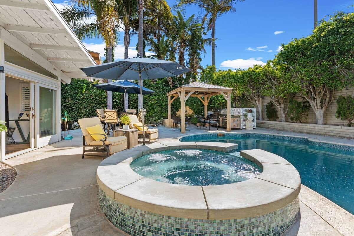 2 Bungalows + 2 Baths just ½ mile from the beach, HB Pier & Main St! The Main Bungalow has a full kitchen, built-in dining nook, queen sofa bed & twin sleeper chair. The 2nd Bungalow offers a queen bed, kitchenette, table for two, sofa & TV. A spacious private patio connects both with dining, BBQ, sail shades & a cozy fire pit lounge. Includes one off-street parking space—perfect for families or friends to share while enjoying Huntington Beach.