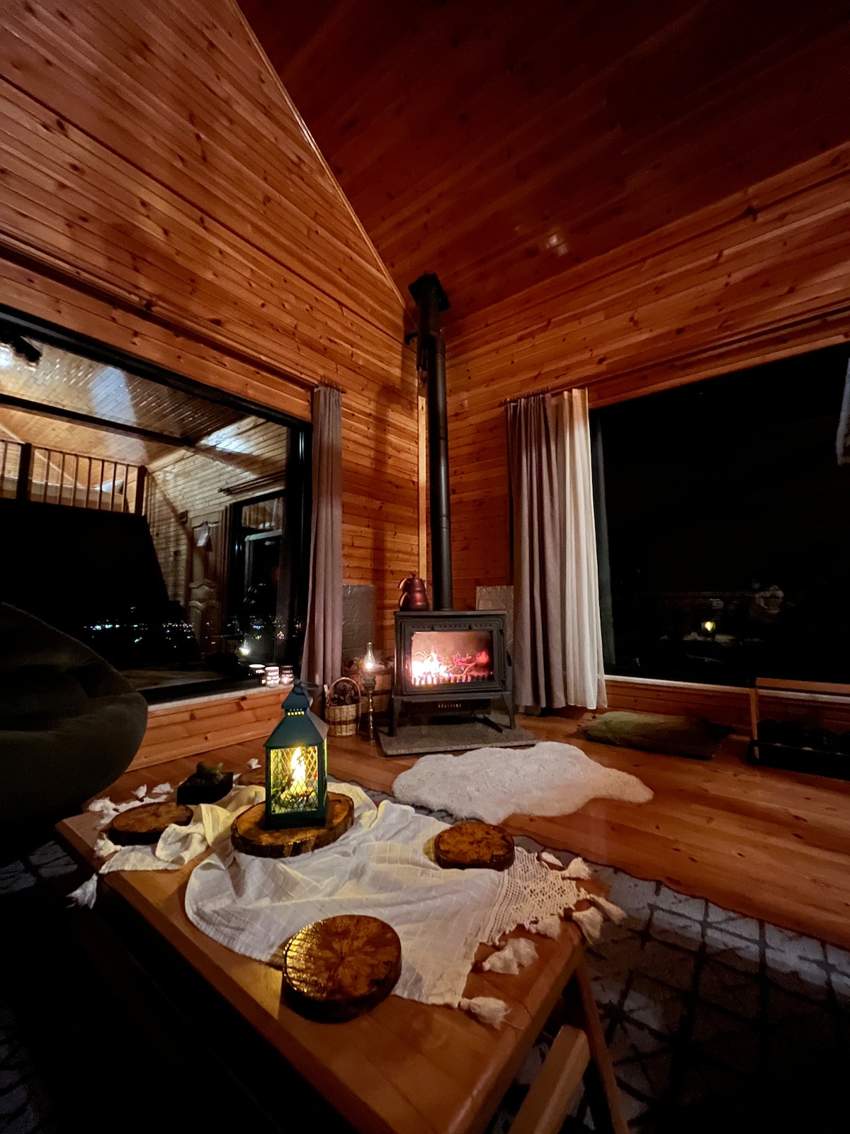 Mudurnuya bagli bir köyün, dag ormaninda ahsaptan yapilmis, etrafinda yalniz orman olan her seyden uzak ama konforlu ve modern dosenmis, harika yuruyusler yaparak ormani kesfetmek icin guvenli ve konforlu bir alan. Hem huzur hem de biraz macera diyorsan bu deneyimi yaşamalısın. Evde bir tercih olarak , gunes paneli ile sinirli elektrik vardir...Işık için mum ışığı, ısınma için şömine, sıcak su için odunlu termosifon kullanıyoruz.