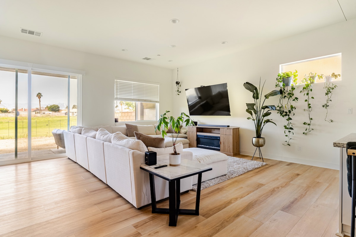 Escape to your private desert oasis—where sunshine, palm trees, and peaceful golf-course views create the perfect Indio getaway. 💦 Saltwater pool & free spa heating 🎮 Game room: pool table, ping pong, arcade & smart TV 🛏️ Sleeps 10: 2 Kings, 1 Queen, Queen+Full bunk 🍳 Chef’s kitchen + coffee bar 🔥 Fire pit, BBQ, outdoor dining & lounge 🎾 Tennis, pickleball & gym (4 guests) 🚗 Near Indian Wells, La Quinta & Joshua Tree