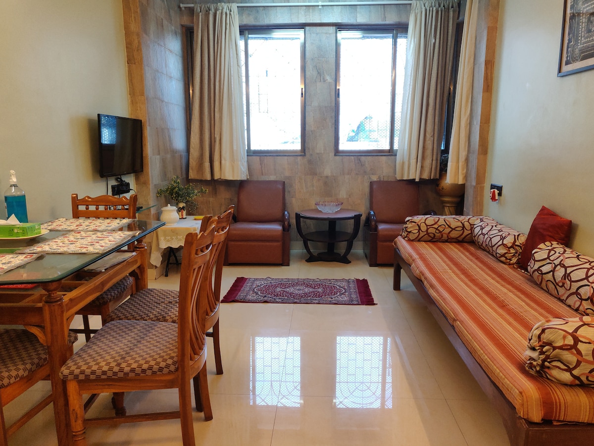 Homely 1BR flat in Prabhadevi -No lift in building flat on 3rd floor. 2 mins walk from Siddhivinayak temple and 10 mins by road to Tata Memorial. It has 1 Bedroom with double bed, wardrobe and AC, 1 Bathroom (bath and washroom are separate). Living room has seating area, TV, AC, single bed and dining table. Kitchen is fully equipped - induction, utensils, fridge, micro, kettle, washing machine, toaster etc. Flat has cable & WIFI.