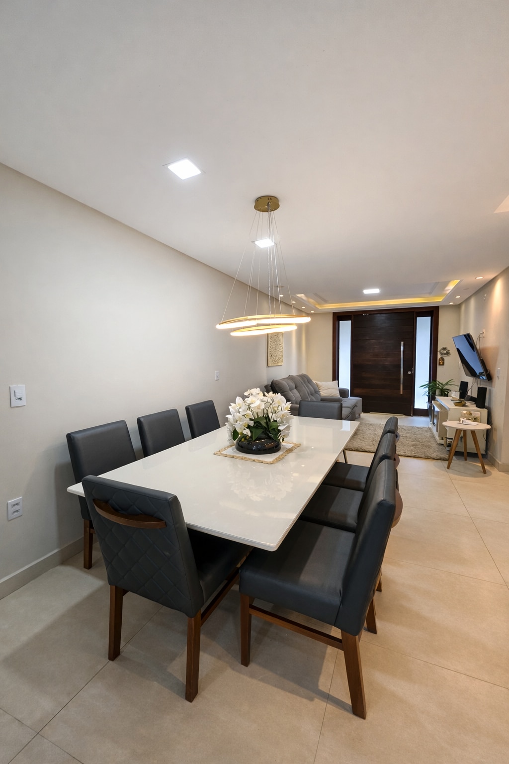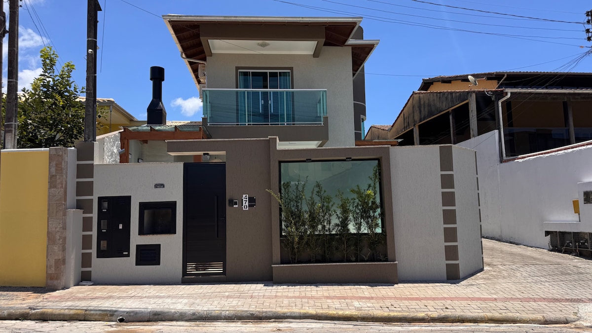 Casa de alto padrão em Bombinhas, a 500 m da praia de Zimbros. Acomoda até 6 pessoas, com 1 suíte, 2 quartos, 1 banheiro social e 1 lavabo. Sala ampla, cozinha e sala de jantar integradas. Área de lazer com piscina privativa, fire place e som ambiente automatizado. Garagem para 2 carros. Bairro tranquilo e fácil acesso às demais praias. 🌊✨