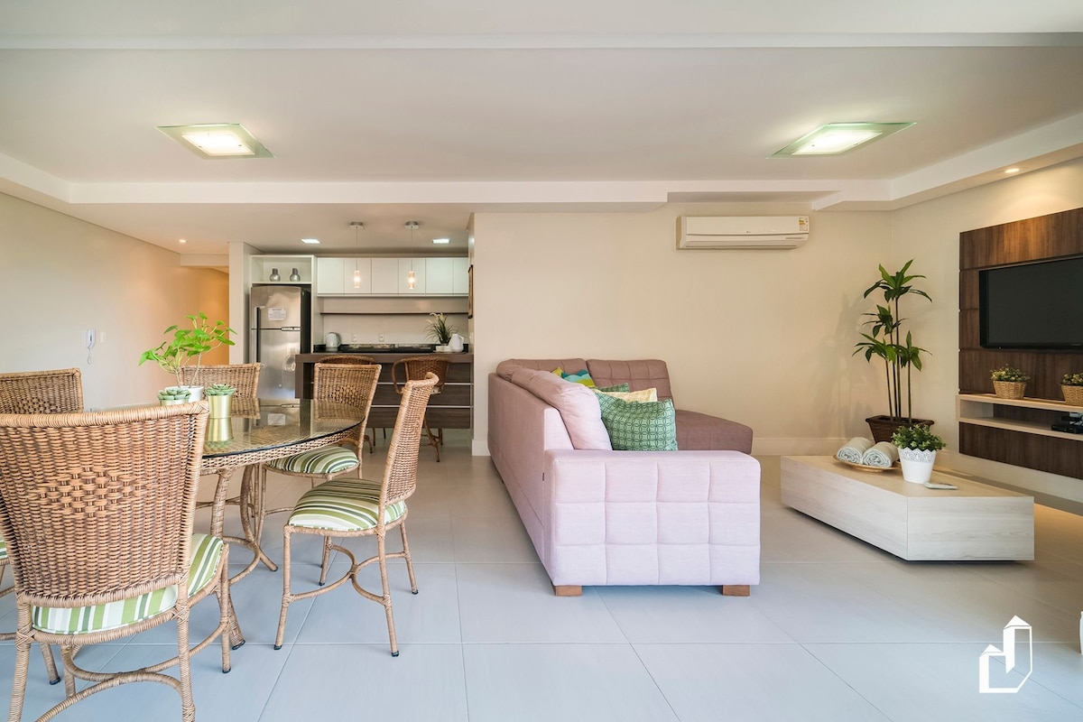 Lindo apartamento de 02 dormitórios - Praia de Bombas - 300 metros da praia. Finamente decorado, camas box, ar condicionado em todos os dormitórios e na sala, cozinha completa com todos os utensílios, máquina de lavar e de secar roupas, sacada com churrasqueira, sala de estar com SMART TV e sistema de canais via satélite e wi-fi. Oferecemos roupa de cama, toalhas de banho, cadeiras de praia e guarda sol.