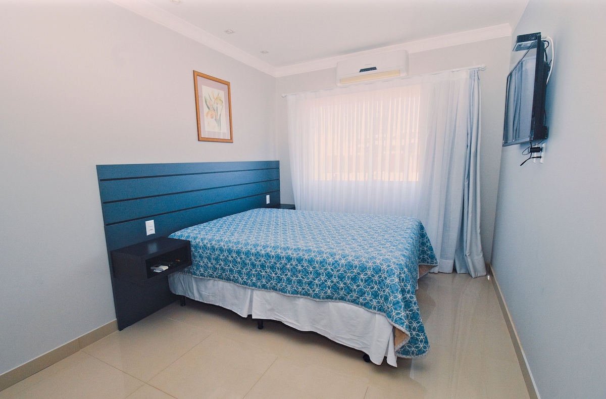 Apartamento com linda vista de Bombinhas, Bombas e Porto Belo. Apto de 1 quarto (casal - cama queen size), cozinha completa, banheiro, sala e sacada c/rede. Moderno, decoração clean, ar condicionado e TV led. A propriedade possui pátio, piscina, churrasqueiras e há 1 vaga de estacionamento (compartilhados). Ficamos 5min a pé das praias: Lagoinha, Sepultura e Retiro dos Padres, zona tranquila e segura, 15 min a pé do centro de Bombinhas. Acesso a cobertura por escadas.