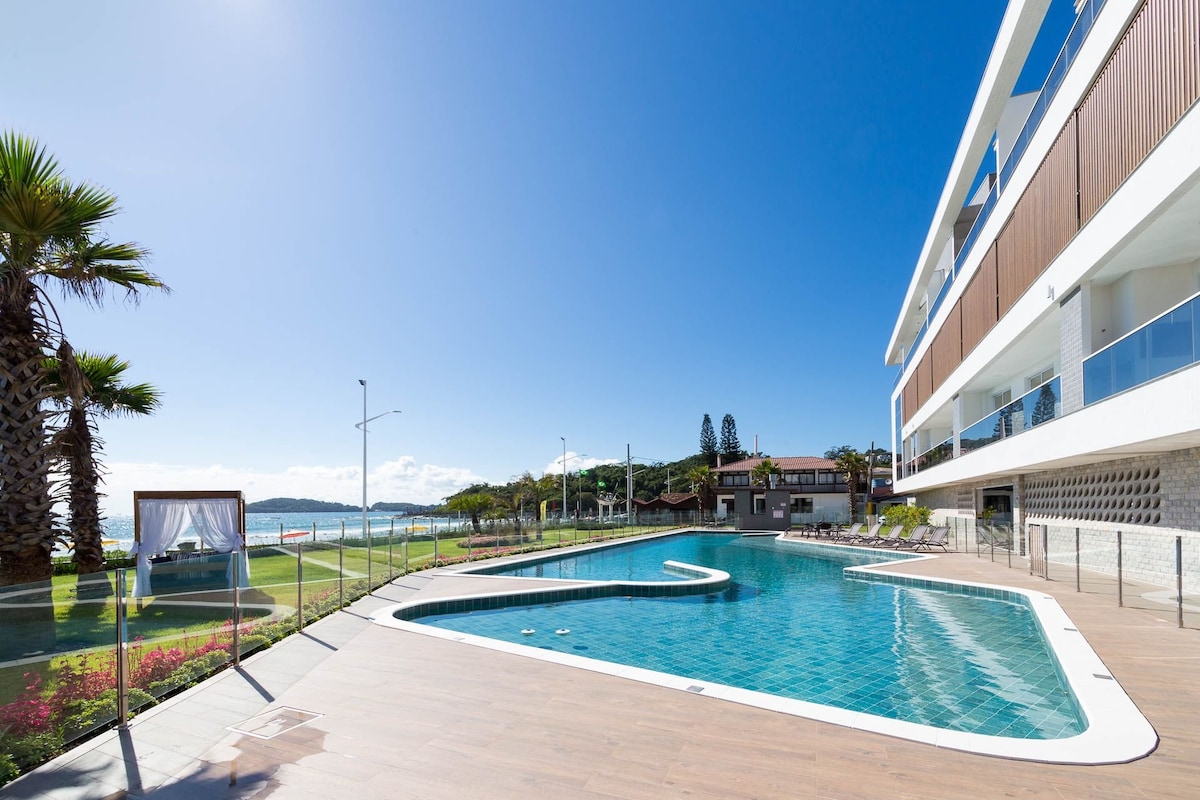 Excelente apartamento mono ambiente com vista panorâmica para o mar e piscina/hidromassagem Ótima opção para as suas férias em Bombinhas Cama box queen size + cama auxiliar de solteiro Ar-condicionado QeF Cozinha completa Smart TV Internet wi fi - "cortesia" Garagem coberta para um carro Capacidade para até 2 pessoas. *TODAS AS AREAS DAS FOTOS SÃO PRIVATIVAS DO APTO. *A PISCINA NÃO É AQUECIDA. *CAMA: COLCHÃO NOVO QUEEN SIZE NOVO MODELO OTOPEDICO EXTRA FIRME (DURO) D40.