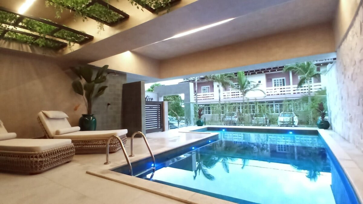 Apartamento com linda vista de Bombinhas, Bombas e Porto Belo. Apto de 1 quarto (casal - cama queen size), cozinha completa, banheiro, sala e sacada c/rede. Moderno, decoração clean, ar condicionado e TV led. A propriedade possui pátio, piscina, churrasqueiras e há 1 vaga de estacionamento (compartilhados). Ficamos 5min a pé das praias: Lagoinha, Sepultura e Retiro dos Padres, zona tranquila e segura, 15 min a pé do centro de Bombinhas. Acesso a cobertura por escadas.