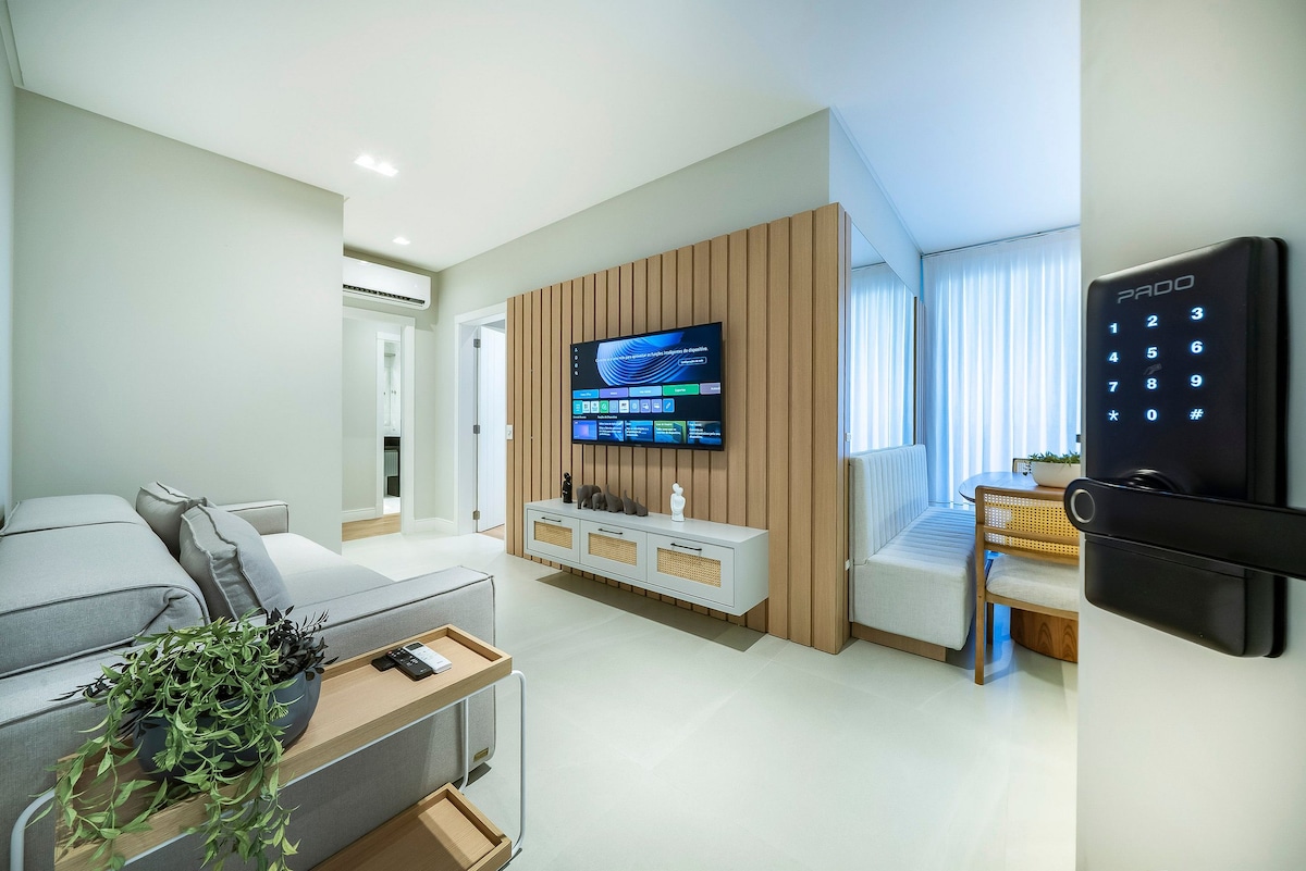 Apartamento luxuoso em condomínio alto padrão com área de lazer com piscina e apenas 120 metros do mar!!! Perfeito para uma familía com filhos, possui 2 dormitórios com A/C e Tv´s smart com móveis sob medida. Vaga de garagem para um carro e Wfi disponível. Excelente localização apenas 120 metros da praia de Bombas, alguns metros de restaurantes, mercados, comércios, farmácias, sorveterias, ciclovia e muito mais...