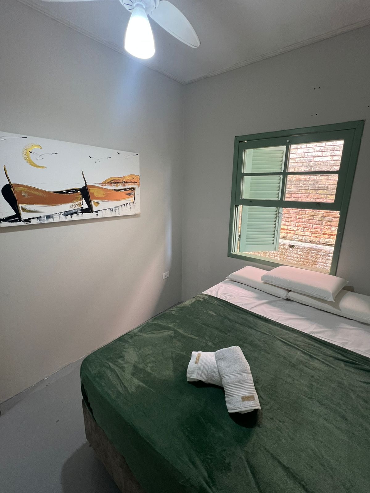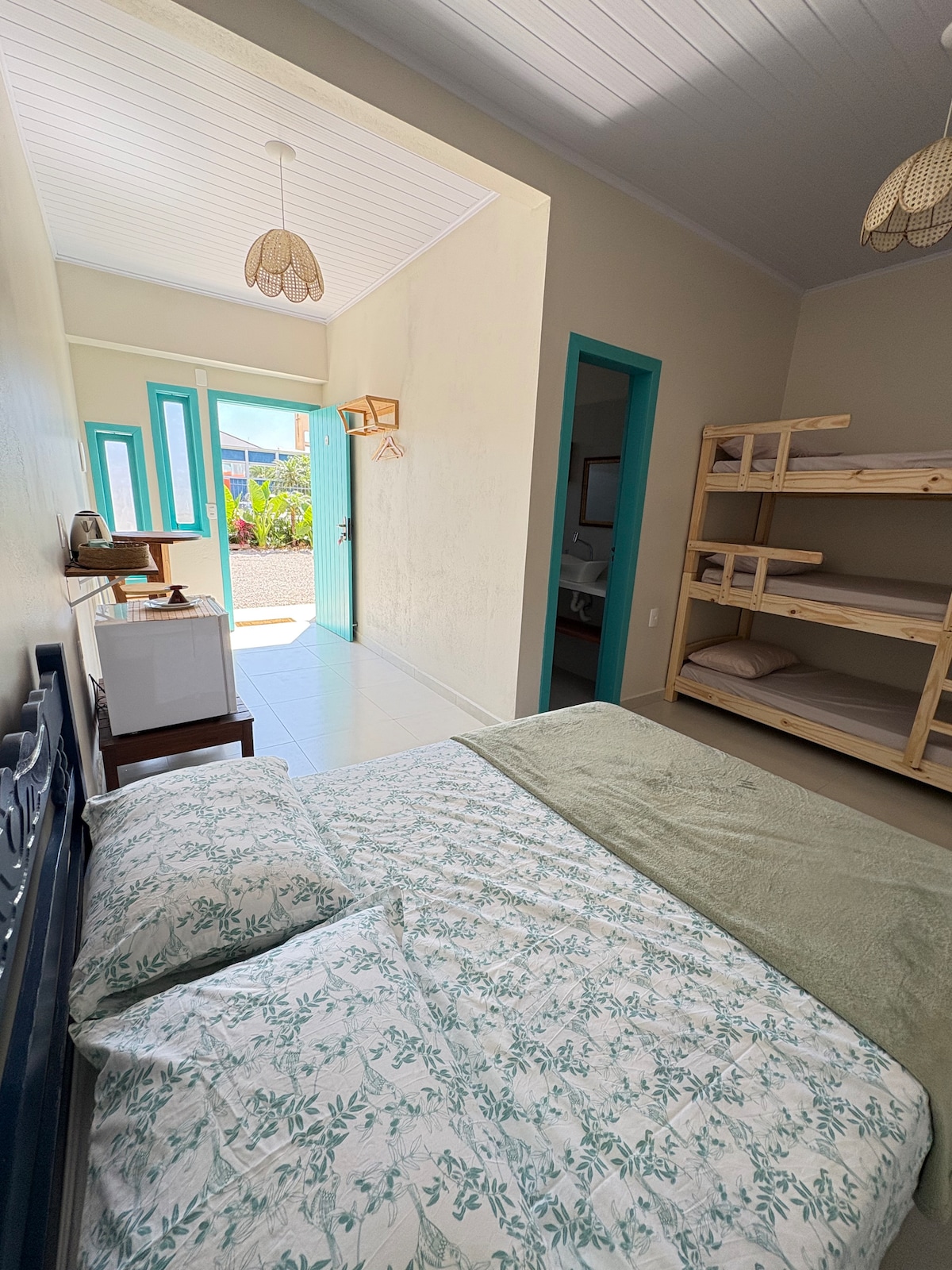 Pequena suíte estilo “cabana de madeira”. O quarto acomoda 2 pessoas, casal ou nao, pois tem uma cama auxiliar em cima. Área verde, ótima localizaçao na praia de Bombas, proximo à Prefeitura de Bombinhas, com mercadinho e padaria na esquina de casa. Ambiente familiar. Tem banheiro privativo (estreito) e uma área externa com uma cozinha compartilhada, que pode ser utilizada para refeições rapidas ou preparar um café. Tem padaria a ima quadra daqui