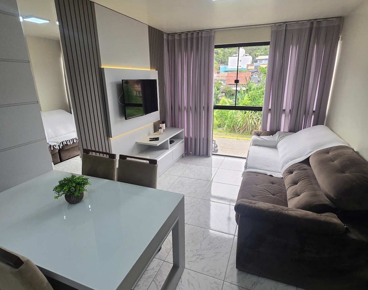 Stay in an apartment 350m from Mariscal beach in Bombinhas, close to nature, in an environmental conservation area. Beautiful fit for couples, equipped with full kitchen, dining table, bedroom with air conditioning and views of the backyard. Located at Condominium Villa Esmeralda, you will find tranquility and rest amidst nature. A perfect place for those who want to enjoy the idyllic scenery of the coast of SC.