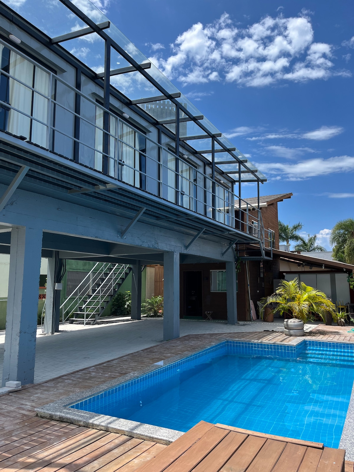 O apto é térreo e feito de container que possui 2 quartos com uma cama de casal cada, com lençol, travesseiros, ventilador. A cozinha é privativa com fogão, mesa, geladeira, pia. Banheiro privativo. A area de churrasqueira privada Internet 600 mega. Compartilhado é a piscina, uma vaga na garagem e lavanderia.
