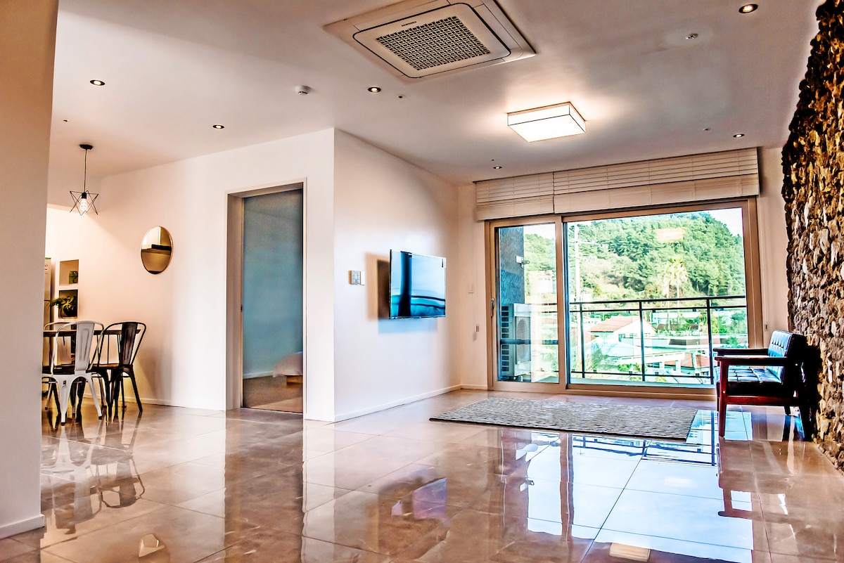 "SEOM Studio" where you can gaze at the beautiful Seogwipo Sea and Beomseom beyond the large window facing southwest. If the weather is good, you can stand on the rooftop of your room or the island building and enjoy the warm orange sunset. We have prepared this space with the hope that the time you spend here will be a moment to fully embrace the beauty of your everyday life. 111, Taepyeong-ro, Seogwipo-si, Jeju-do