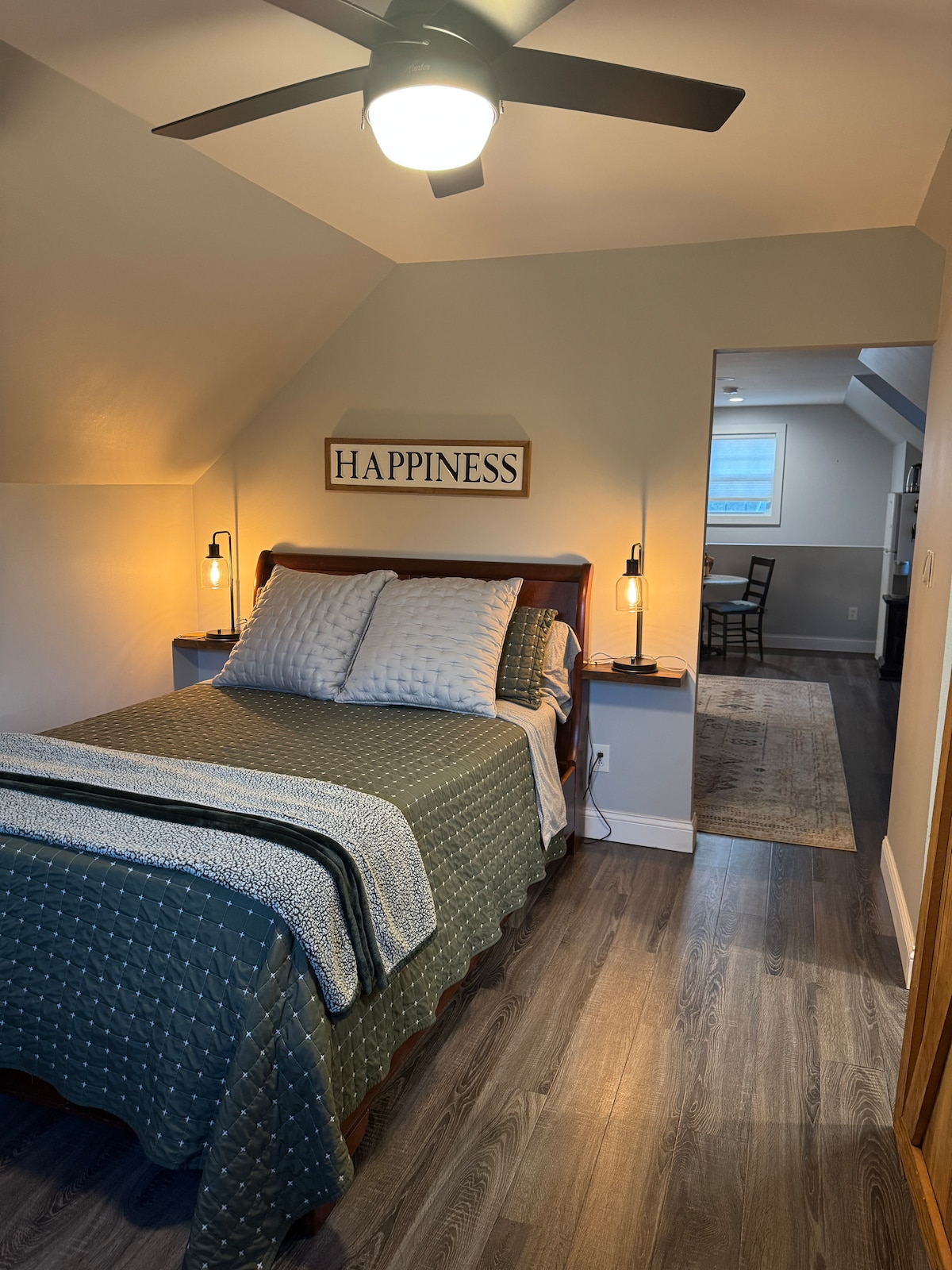 • 2 bedrooms, sleeps 4 • 1 x king size bed and 2 x single beds. • 1 full bathroom, walk in shower. • Full kitchen, large island, all essentials. • Extra bed linens, blankets and pillows. • Hangers, iron & clothes storage. • Body soap, conditioner, shampoo, hair dryer. • Softened and filtered water • Central HVAC • WI-FI & ROKU TV • 2 car garage with level 2 EV charging station. • Outdoor dining with pellet grill • Plenty of parking space • Self check-in • No stairs!