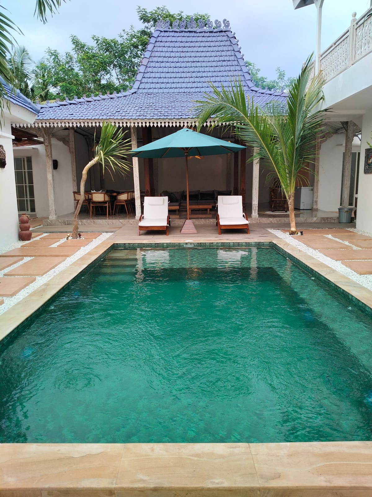 A home with three separate bedrooms, each with a different traditional style with public kitchen and ‘pendopo’ as space to chill out. Perfect for big family or friends gathering. Balinese Room 1 Queen bed 2 bunkbed (4 px) Javanese Room 1 single bed 1 double bed 1 wardrobe Panglipuran Room 1 Single Bed 1 wardrobe 2 Bathroom w/ showers Kitchen with stove, mini fridge, and water dispenser An area to hangdry clothes Bale Delod and Jineng are two open areas that can be used for gathering