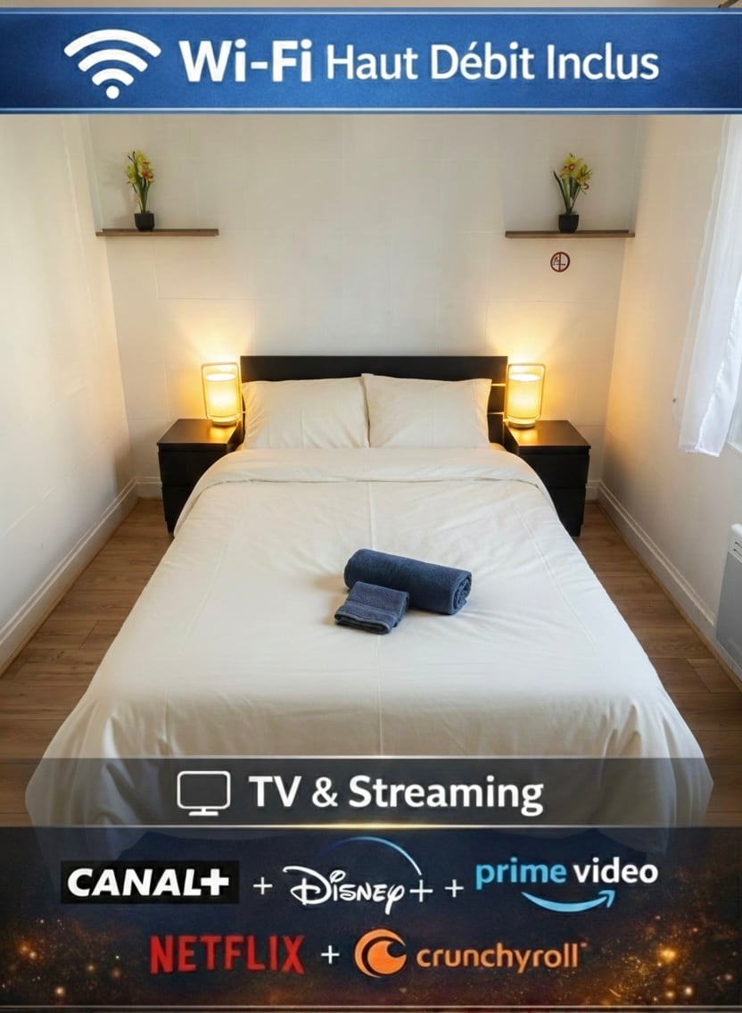 Vivez une expérience unique dans cette luxueuse Love Room parisienne: ・Idéale pour un séjour romantique à deux ・Lit Queen Size (160x200cm), Matelas ultra confortable ・Jacuzzi privé et sauna pour des moments de détente absolue ・Rétroprojecteur pour vos soirées cinéma en amoureux ・Cuisine entièrement équipée ・Lave-linge séchant ・Environnement calme ・Wifi rapide et sécurisée ・Ambiance lumineuse personnalisable 〉Réservez votre escapade romantique dans un cocon de bien-être à deux pas de Paris !