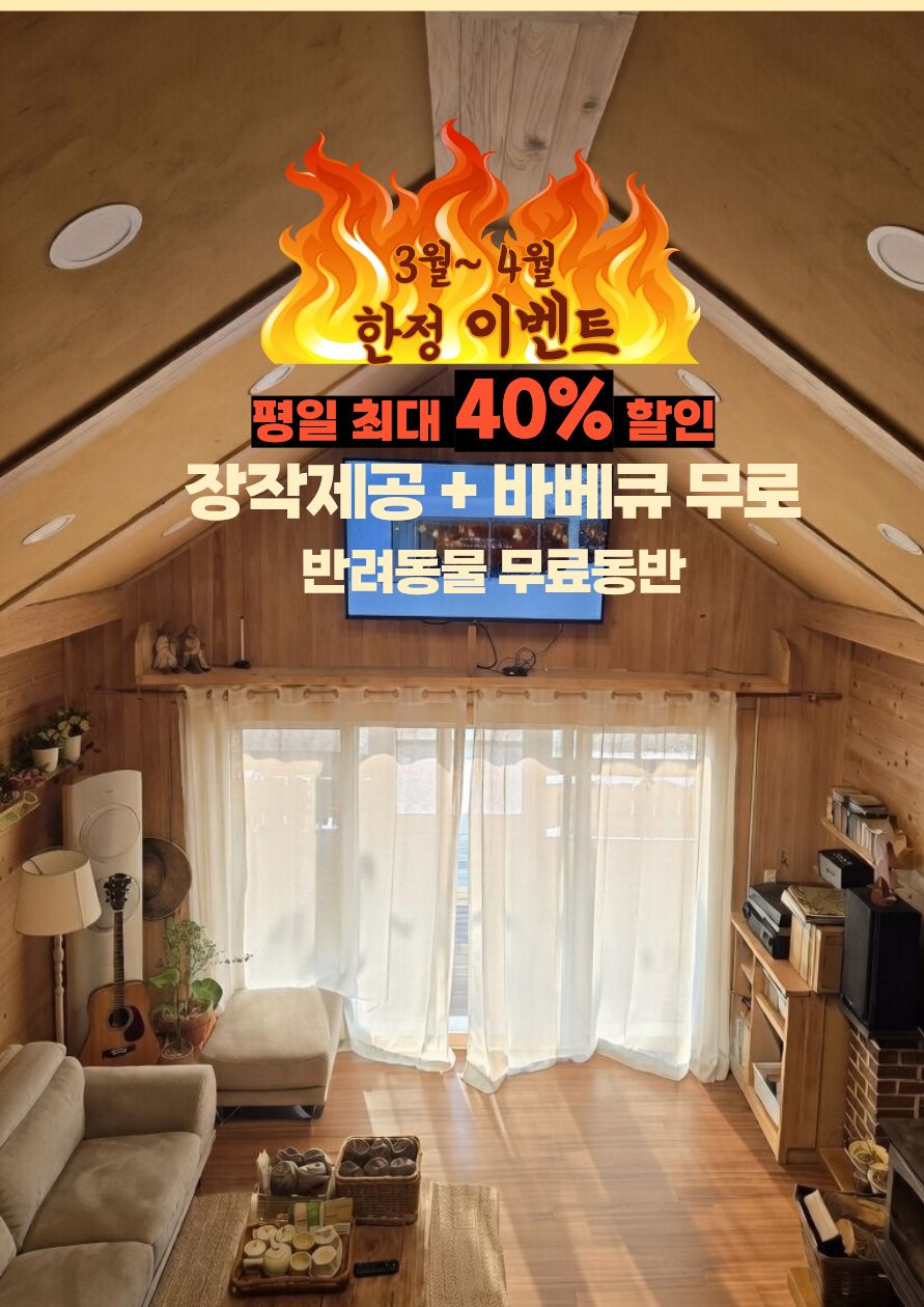 저희 집은 강원도 영월 태화산 근처에 위치해 있는 공간으로, 청령포.장릉.고씨동굴.동서강정원연당원.라디오스타박물관.사진박물관.별마로천문대(셔틀타는곳) 차로 15분거리에 있으며, 한반도지형은 25분, 젊은달 y파크 35분거리에 있습니다. 어린이 동반한 가족은 4인까지 가능하며 성인은 3인까지 가능합니다. 복층형으로 되어 있으며, 가을부터 봄까지 실내에 있는 벽난로를 즐기실수 있으며 숙소앞 정원에 앉아서 여유로운 분위기와 함께 바베큐도 가능하구요, 독립된 공간으로 두채를 운영하고 있습니다. 편안한 휴식을 취하고 싶은 분들을 환영합니다. *무료 픽업서비스 *무료바베큐서비스 *장작구매가능 *실내 벽난로는 10월~3월운영 *전기차 충전 가능