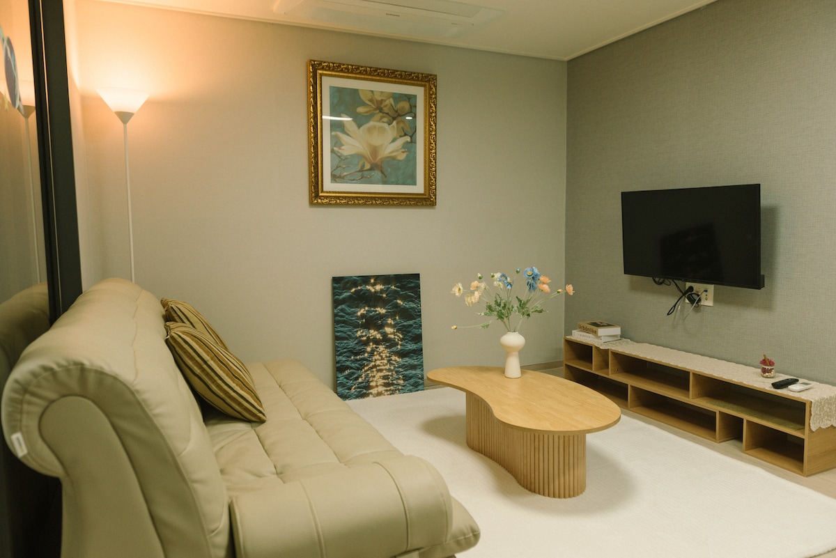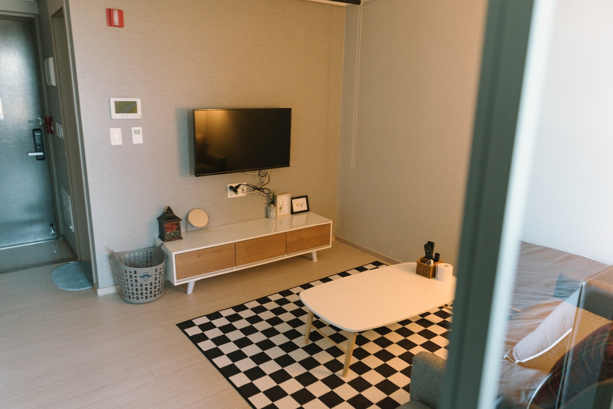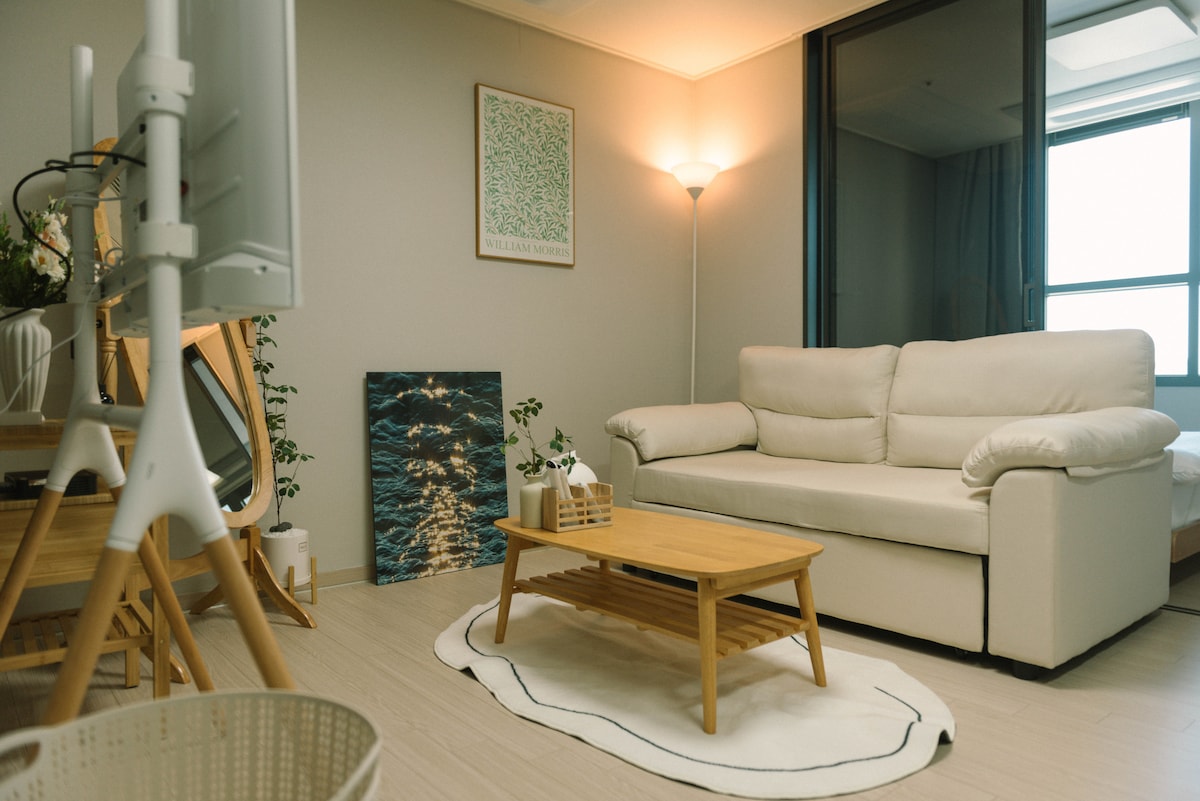 2023 Grand opening, E7 in Jukdo. -One Studio Room (Double bed) -Just in front of Dongsan Beach, 10Sec from the Beach -Check In from PM4:00 -Check Out by AM11:00 -3Min by car from Jukdo Beach, Ingu Beach -15Min by car from Jumunjin Beach, BTS MV location -30Min by car from Kyungpo Beach, Sok-Cho and Seolak Mountain. -Refrigerator, Electric range, Microwave, Dishware, Pot, Frying pan -Shampoo, Hair conditioner, Body shampoo, Tower Thank you:)