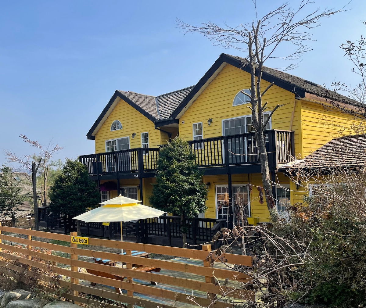 당단풍과 느티나무로 둘러 쌓인 2,300 평 부지 위에 지중해 풍으로 지어진 아름다운 주택입니다. 해발 700 미터 고도에 지어진 숙소는 봄에는 철쭉, 여름에는 하얀 데이지 꽃으로 가득하며 가을 단풍과 겨울 설경도 일품 입니다. 6-8월 에는 숙소 단지 내 블루베리 농장에서 블루베리 따는 체험도 할 수 있습니다. 평창 동계 올림픽이 열린 휘닉스 파크 스키장에서 5 분거리에 있으며, 주변 관광지로는 메밀꽃 필무렵의 이효석 생가, 봉평 전통시장, 허브나라, 오대산, 태기산, 대관령 목장등이 있고 강릉까지는 45 분 거리 입니다.