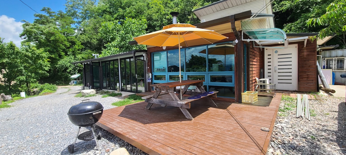 Three rooms, three bathrooms, free barbecue for all seasons! It's a large double-decker pension of 27 pyeong The standard number of people is 5 and up to 6 people! It's a two-story pension You can enjoy the great scenery through a large window throughout the house Change bedding every day There is an air conditioner in each room, a toilet bidet installation, and a washing machine. You can use a large lawn of 200 pyeong in front of the pension