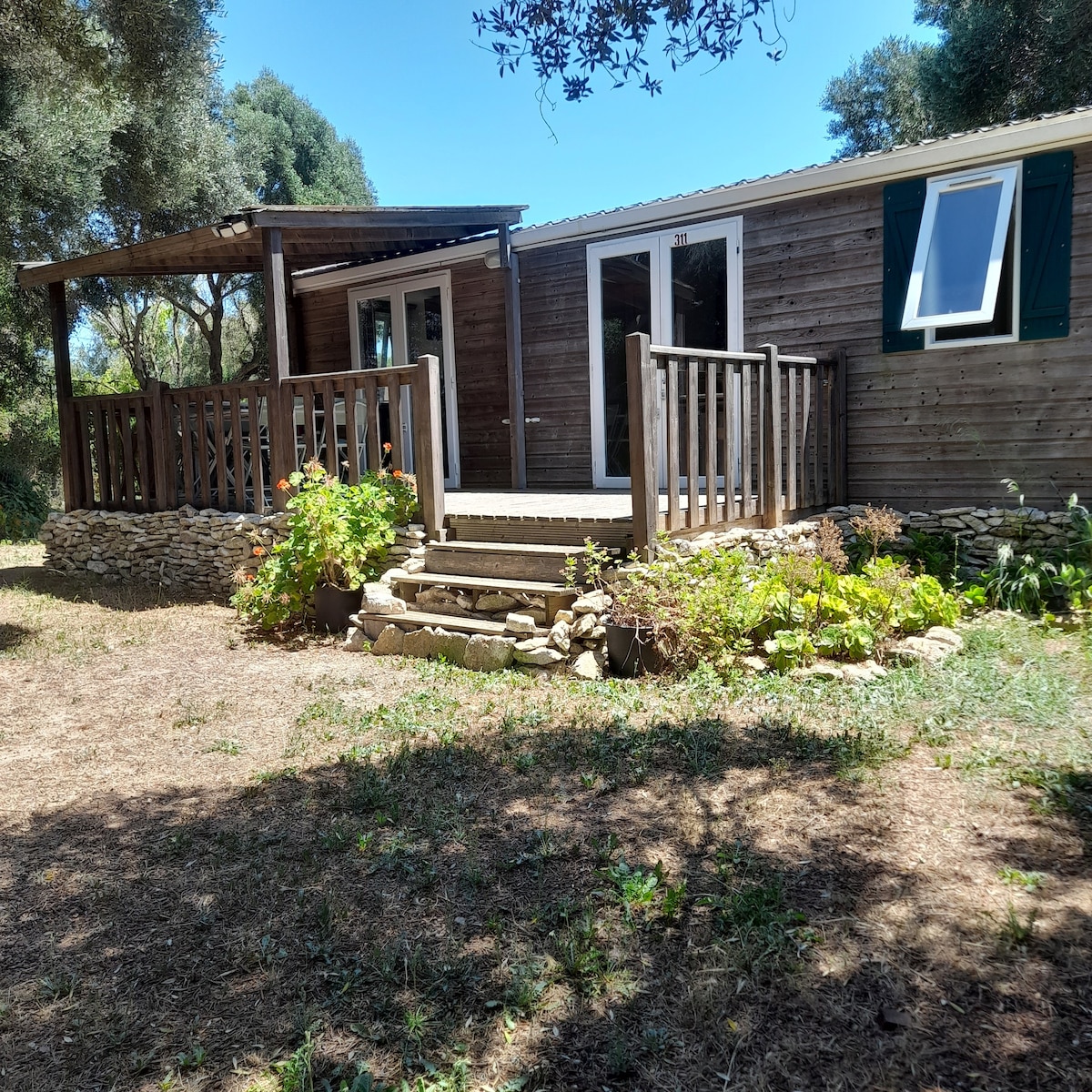 Oubliez vos soucis dans ce logement spacieux et serein. Bungalow climatisé, wifi et équipé: -une Kitchenette -machine a café -micro-onde -plaque chauffante -petit frigo -bouilloire -toaster -sèche cheveux -vaisselle, stencils , draps et serviettes inclus. Situé a 5km de Bonifacio en voiture et a 15min a pied via un sentier qui mène a Bonifacio ou a la plage de la Cayenne qui se trouve en face de la ville. Seul bémol, terrain en aménagement, dans l'attente d'y recevoir de jolies plantes ;)