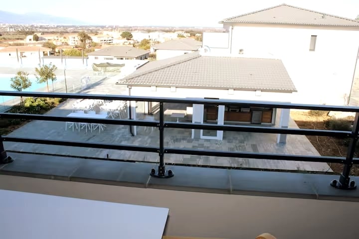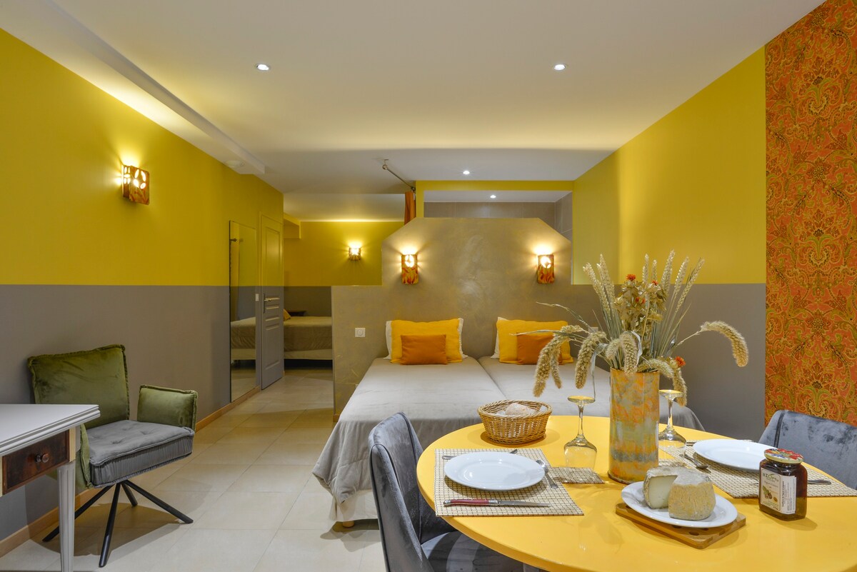 Offrez-vous une escapade de luxe avec une vue imprenable sur le Golfe et la Ville de Porto Vecchio. Notre suite, d'une superficie de 60m2, comprend une chambre lit Kingsize, une télévision à écran plat, une salle de bain moderne avec douche à l'italienne, et des toilettes indépendantes. Vous trouverez également un coin kitchenette'une terrasse privée avec coin repas et salon Piscine non chauffées du 1er Novembre au 1er Mai Possibilités de petit-déjeuner en suppléme