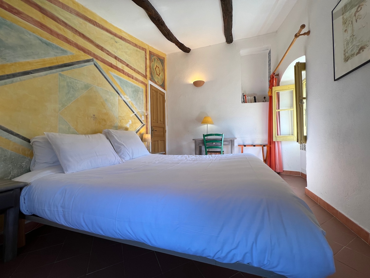 Chambre double 15m² avec balcon Vue montagne et mer. Confort et charme au rendez-vous dans cette chambre avec lit queen-size (160x200), balcon privatif offrant une superbe vue montagne et mer, douche spacieuse (120x90), climatisation, Wi-Fi, TV, mini frigo. Parfait pour un séjour à deux en toute tranquillité.