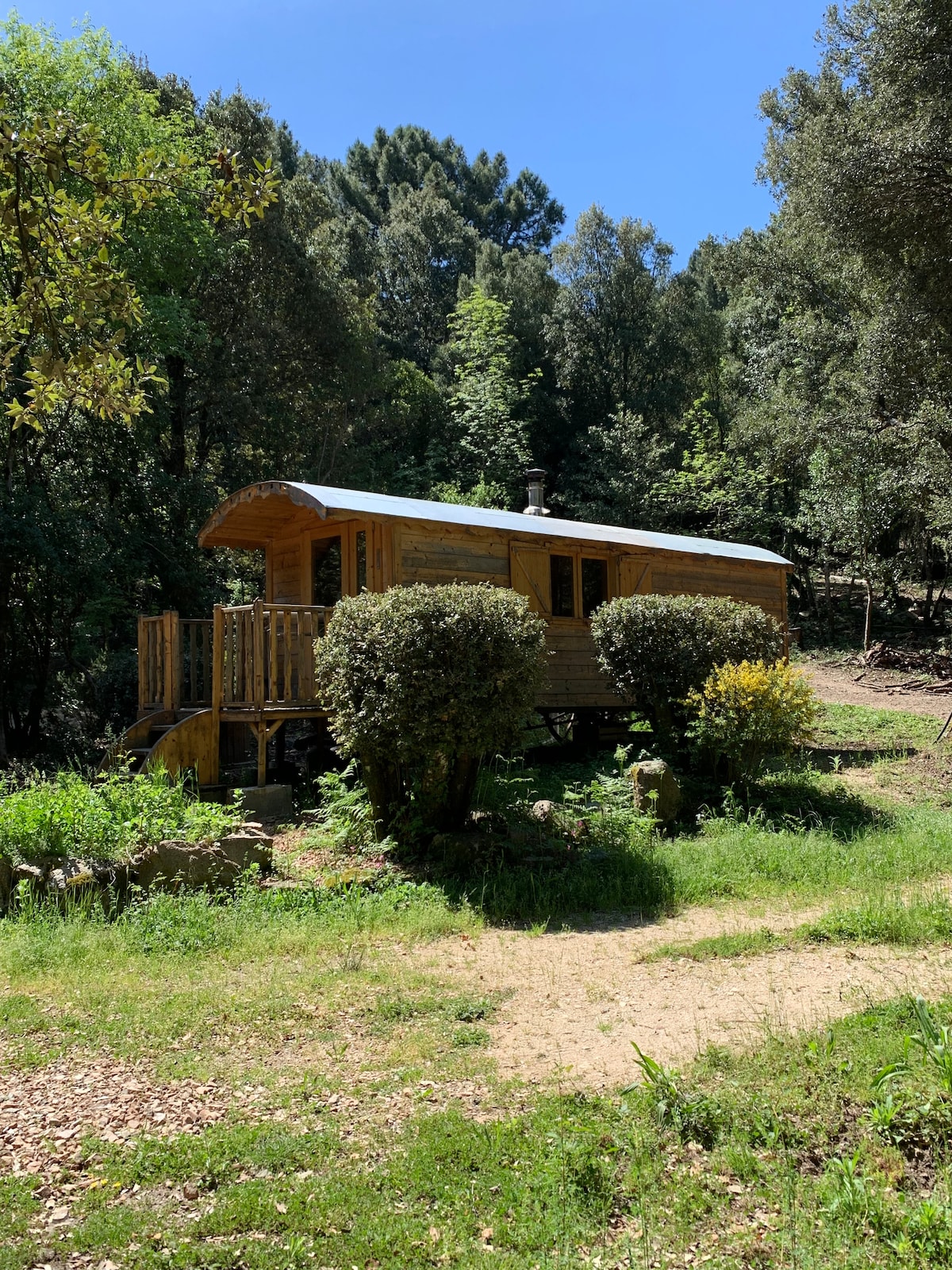 Le logement est une véritable roulotte de collection immatriculée, sur un terrain privatif entouré de murs de pierres sèches et d'arbres. L'intérieur est tout en bois, climatisé, avec une grande baignoire dans la salle de bain. Sur le terrain il y a un coin repas sous les chênes, un barbecue, hamac, balancelle, bains de soleil, coin apéro. Le tout entouré de montagnes, à 2 mn à pied de la rivière, à une demie heure de la mer.