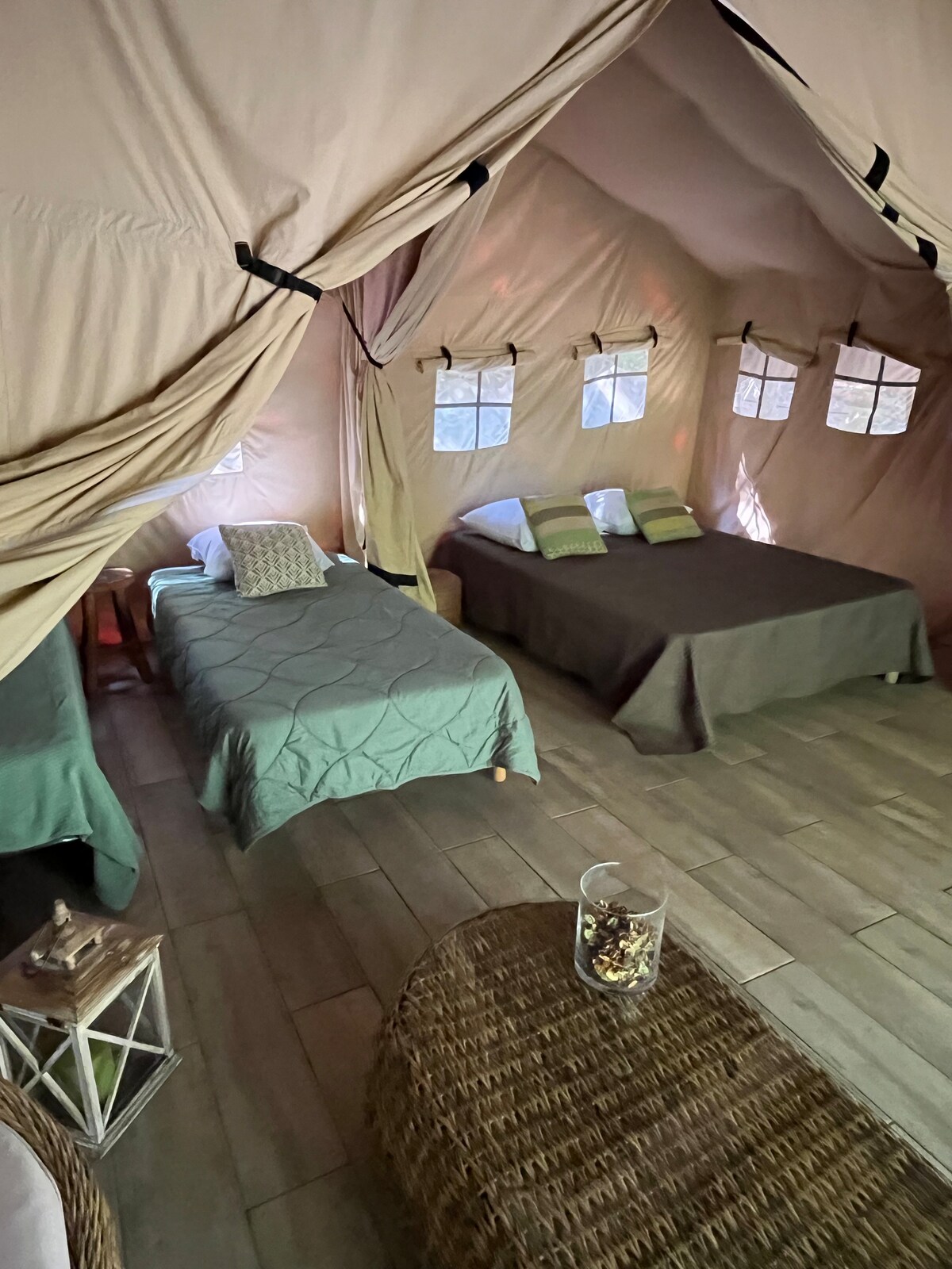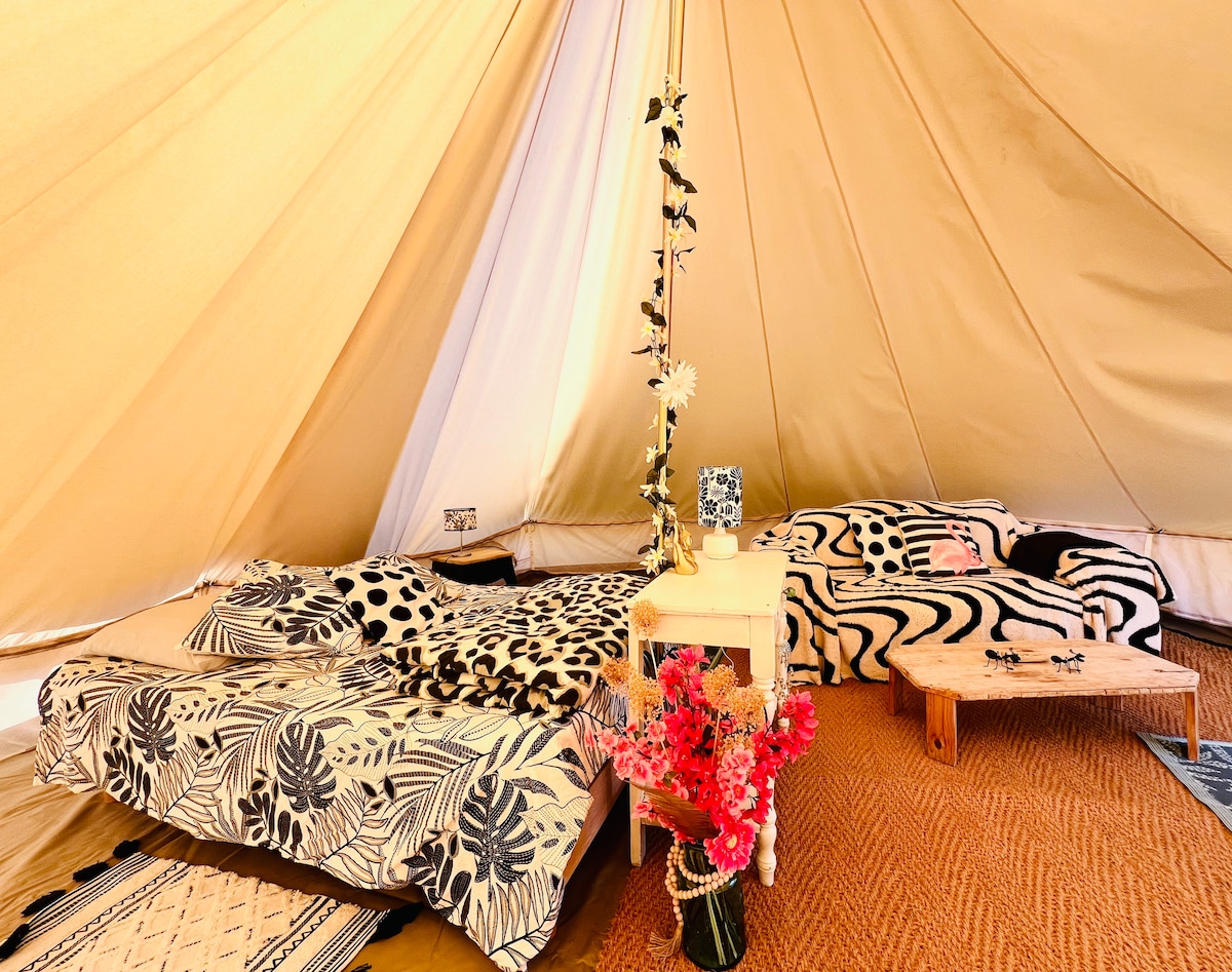 In the middle of nature with sea view this gorgeous Glamping tent of 25 squares meters King bed organics sheets and Towels Bohemian chic inside Shower and bathtub outside with water from the source Kitchenette for breakfast + fridge Relax area tables and lounge Like 5 stars resort More photos are coming soon