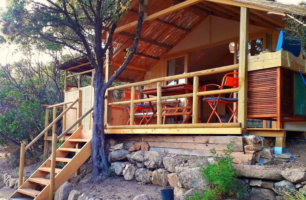 Perché sur les hauteurs et surplombant le golfe d'Ajaccio, le domaine Sarra di Sole vous propose deux écolodges : une tente safari et une maison en ossature bois, pensés dans une mouvance entièrement écologique : énergie et eau chaude solaire, matériaux de construction naturels ou recyclés. La tente est installée sur une grande terrasse sur pilotis. Vous y trouverez un espace repas, détente ainsi qu'une cuisine extérieure équipée. Atmosphère idyllique, romantisme et contemplation...