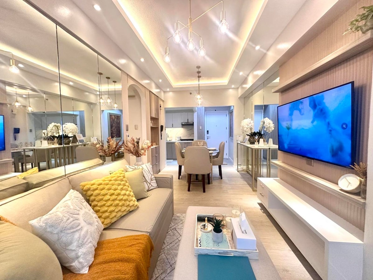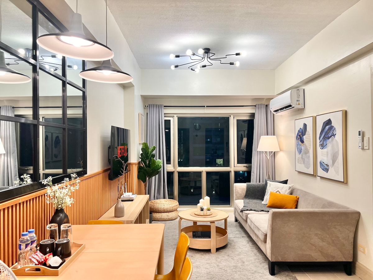 Book this luxury stay at the center of BGC. Everything is just a few steps away. Prime offices and high end malls surround Uptown Parksuites. Experience a cosmopolitan getaway at the Uptown Mall. Explore unique food and shopping concepts. Party the night away at premier bars right at your doorstep. Unwind in our Mid Century Modern bedroom unit. Comforts include a 55 inch SMART TV, 400 MBPS internet and a study area. Enjoy a comfortable and stylish experience at this centrally-located place.