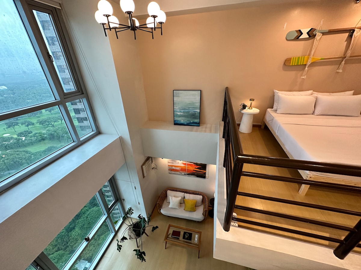 This 1BR Loft apartment is fully furnished, spacious, and modern, and it has an excellent golf course view. It is your perfect base when visiting Manila. The unit is furnished with frequent travellers and long-stay guests in mind. It is equipped with a fast and reliable Wi-Fi connection, and it's just a few steps away from restaurants, bars, shopping malls, offices, and hospitals, ensuring an enjoyable and comfortable stay. Book now and experience a home away from home!!