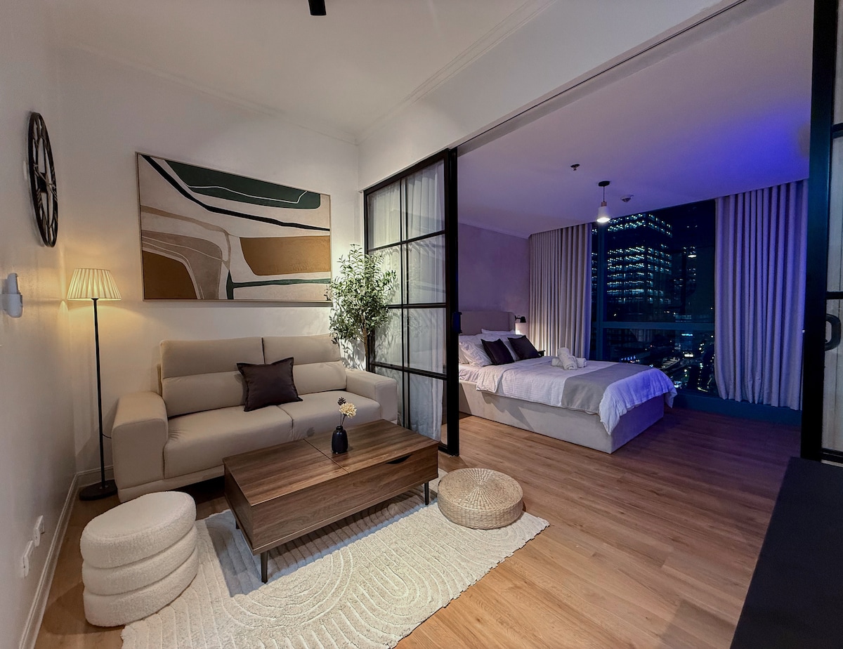 This stylish 1BR unit in One Uptown Residences has been renovated and thoughtfully designed for a clean, cozy stay. Glass dividers let natural light flow through while keeping privacy between the bedroom and living area. Located on a lower floor with a rare view of Uptown Mall and BGC city lights. Enjoy blackout curtains, comfy bedding, Netflix, YouTube Premium, and everything BGC has to offer just steps away.