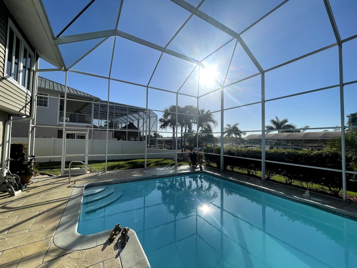 ONE OF THE BEST WATERFRONTS IN CAPE CORAL! A short walk to the beach a. This 2,500+sq ft home has stunning sunsets and South Western water views from all main living areas,as well as the Master Suite. Heated pool w/ LED colored lighting, built in Spa,Pool bath, full laundry facility, Lanai,Fireplace ,Wi-fi and TVs in every bedroom, private dock . Boat on lift for rent w/RPM rentals . Large 2-car garage w/5 bicycles,beach wagon & cooler on site.