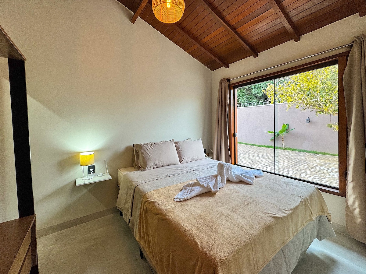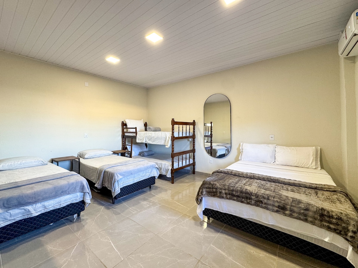Perfeito para familias, quarto espaçoso, com 1 cama casal grande + 2 beliches. Totalizando 6 lugares em camas. Quarto com banheiro privativo, ar-condicionado, frigobar, moveis planejados, roupa de cama e banho, limpeza diária e pela manhã um delicioso café da manhã já incluso na diária. Possuimos piscina, churrasqueira, cozinha compartilhada, redário, wi-fi, estacionamento, entre outros.