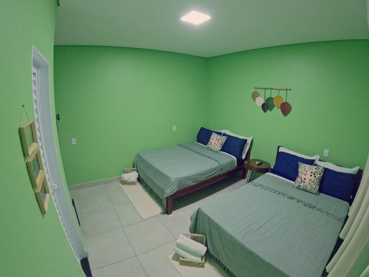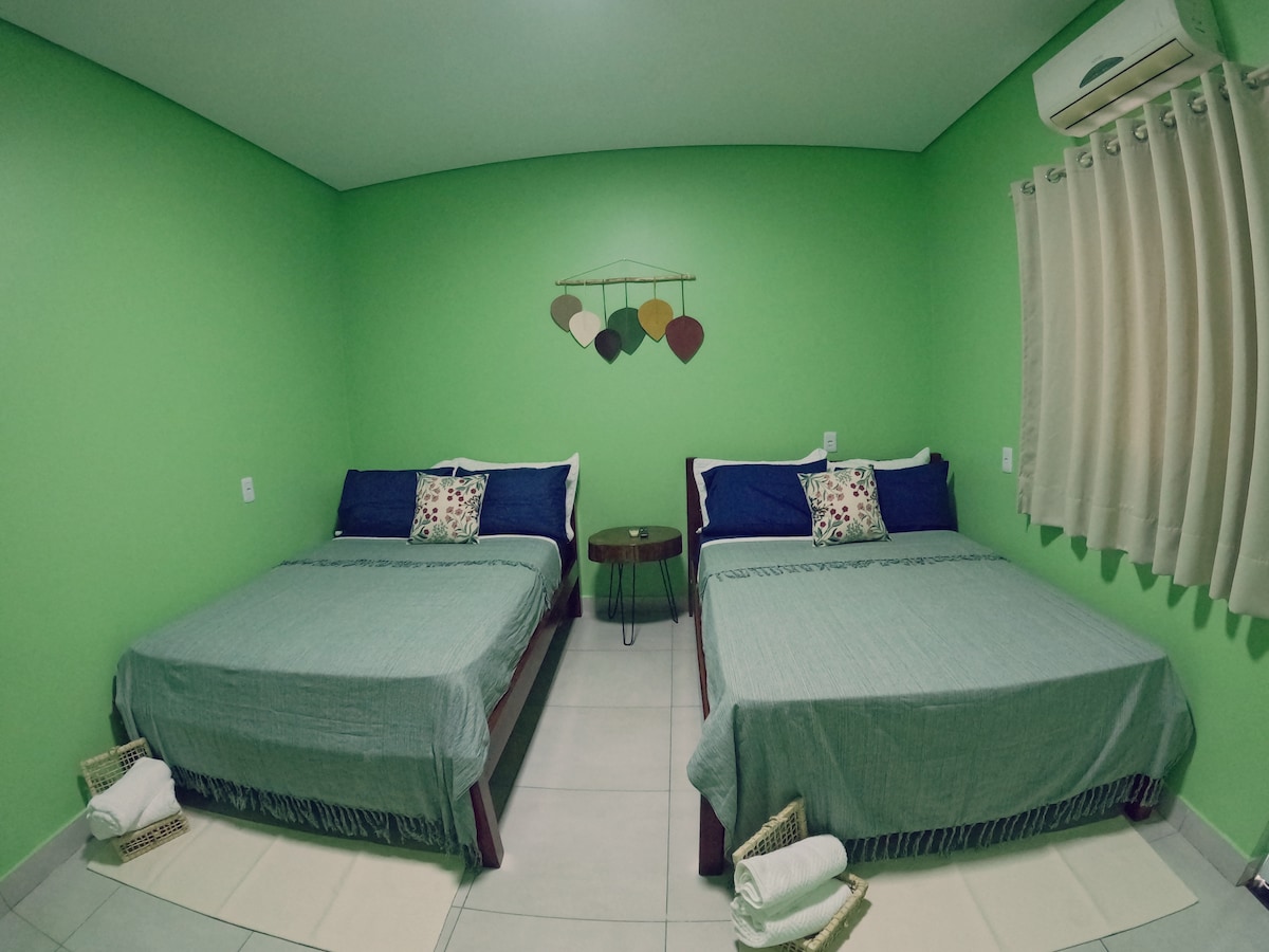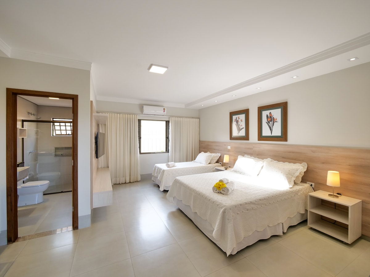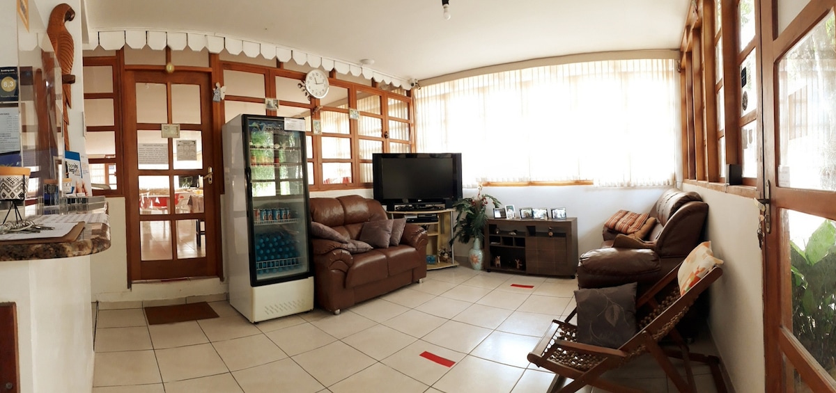 · Apartamento privativo completo, com ar condicionado, TV 24'', frigobar e banheiro privativo. . Café da manhã . Limpeza · Piscina. · Piscina com hidromassagem. · Wi-Fi gratuito. · Jardim com redário. · Estacionamento interno gratuito. · Salão de jogos com mesa de bilhar, pebolim e saco de boxe. · Churrasqueira para locação. Apenas a 5 minutos (de carro) e 20 minutos (a pé) do Centro de Bonito - MS.
