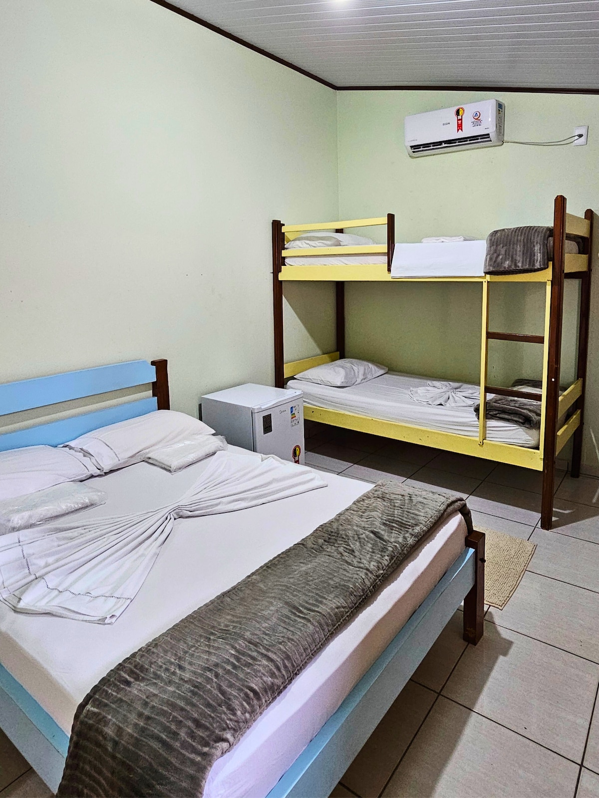 Acomodação privativa, com cama de casal, beliche, frigobar, ar condicionado e banheiro privativo.
