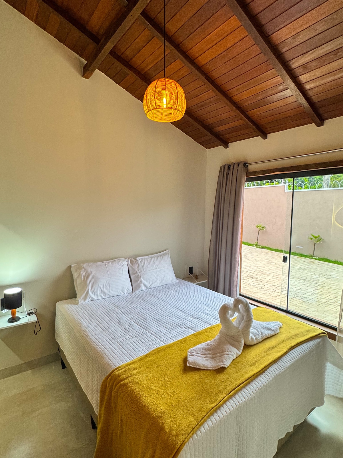 Casa em condomínio à 5 quadras do centro de Bonito. Além dos quartos com ar condicionado, possui um banheiro e uma sala-cozinha com sofá-cama, mesa, TV e ventiladores de teto. A cozinha possui fogão, geladeira, microondas, forninho elétrico, cafeteira e demais utensílios. Dispõe de Wi-Fi, opção de rede de deitar junto a entrada da casa, além de vaga de garagem. Possui ainda lavanderia com tanque e máquina de lavar roupas, junto a quintal privativo com churrasqueira portátil e bancos ao ar livre.