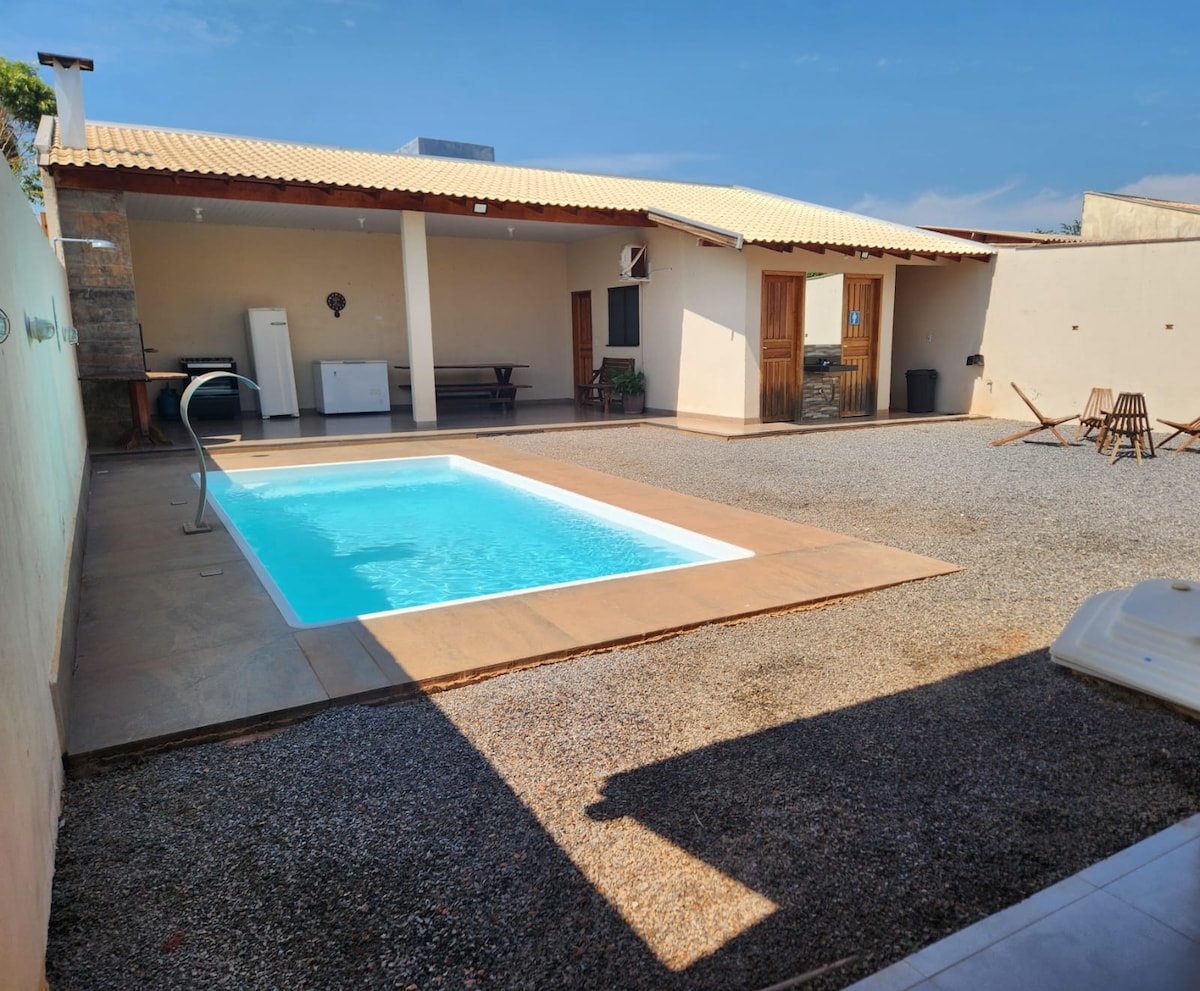 A casa é ótima para quem gosta de espaço e privacidade.Possui estacionamento Ar condicionado,internet.O quarto possui 01:cama de casal ,01 beliche e 01 de solteiro.Oferecemos aos hóspedes forros de cama e banho.Tem uma varanda ampla cozinha gourmet,fogão Cooktop,ducha externa,geladeira,forno elétrico 50 litros,liquidificador,sanduicheira grill, ferro de passar roupas.E todos utensílios necessários para o preparo dos alimentos e churrrasqueira,fica 5 minutos do centro da cidade,check in livre.