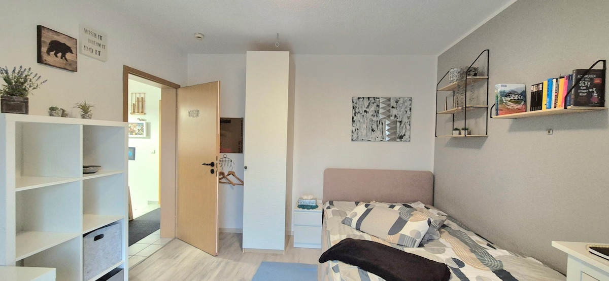 Dieses Zimmer verfügt über ein Arbeitszimmer über das man in das Schlafzimmer gelangt. Es sind dementsprechend also 2 Zimmer. Ideal für Studenten und Kölnbesucher. Bis zur Kölner Innenstadt sind es mit der Linie 18, 15 Minuten. Die Filmstudios in Hürth-Kalscheuren und der Hürth-Park befinden sich in unmittelbarer Nähe.