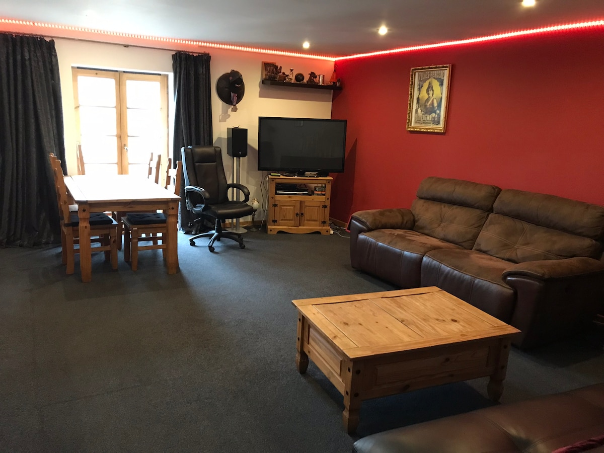 Contemporary ground floor flat. Open plan kitchen/living room/breakfast bar, shower room, spacious bedroom with access to shared rear patio & garden & utility room. Located in trendy Leith, a 15 min walk from town or tram at top of road. Suits young couples/friends. Easy access from airport or station. Loads of bars, restaurants & coffee shops on Leith Walk & the Shore. Easy walk to all the tourist sights & city centre or short bus or tram ride. Nice park nearby.