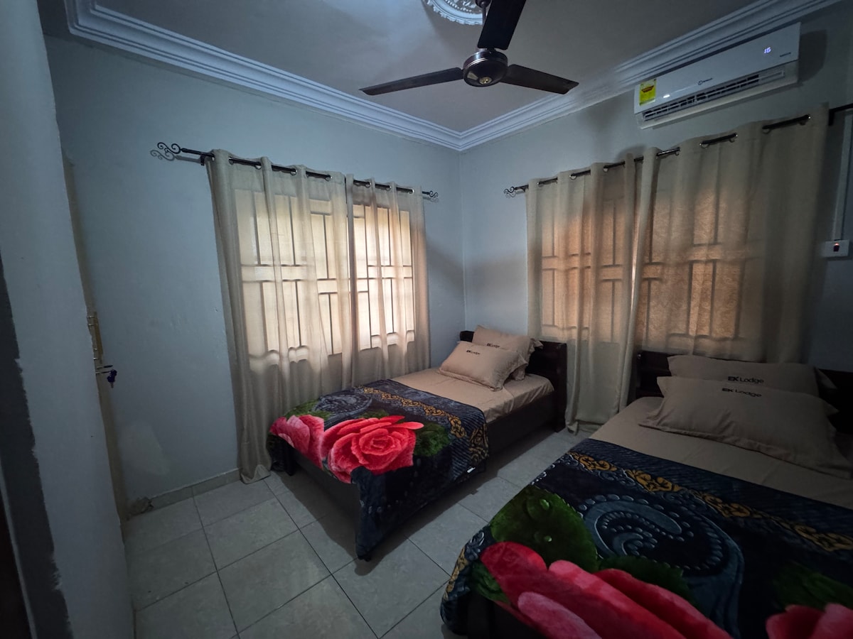 A 2 bedroom home away from home with, modern touches and privacy, to make your stay very comfortable. There's unlimited WIFI, standby generator and also an electric fence for your safety and security.