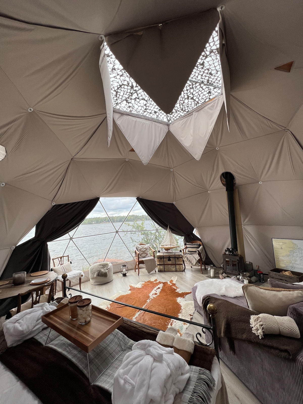 Njut av naturen när du bor på detta unika ställe. Du bor i vårt glamping/kupol tält med plats för två. Egen strand, uteplats, grillplats, vedeldad kamin och underbar utsikt. Maten lagar du över öppen eld eller på en kokplatta i tältet. Du roas av vågskvalpet som vaggar dig till sömns. Ni har tillgång till toalett och dusch i närheten av tältet. Dricksvatten finns i en dunk. Diskar gör du i havet. Inga tillfälliga obokade besök tillåts på fastigheten utöver de två bokade. Varmt välkomna