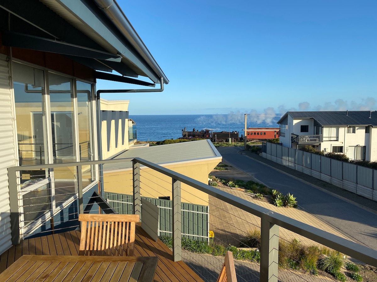 Peaceful and centrally located at The Dolphins on the beachfront, with panoramic views of Horseshoe Bay, this upstairs apartment offers a slice of scenery and position rarely available at Port Elliot's best family beach. Linen provided, fast wifi, free car parking, and only a short walk to the beach, local pubs, cafe's and shops. With a private balcony, you can enjoy uninterrupted views of the historic granite headlands, wake up to beautiful sunrises, and relax to the sound of waves below.