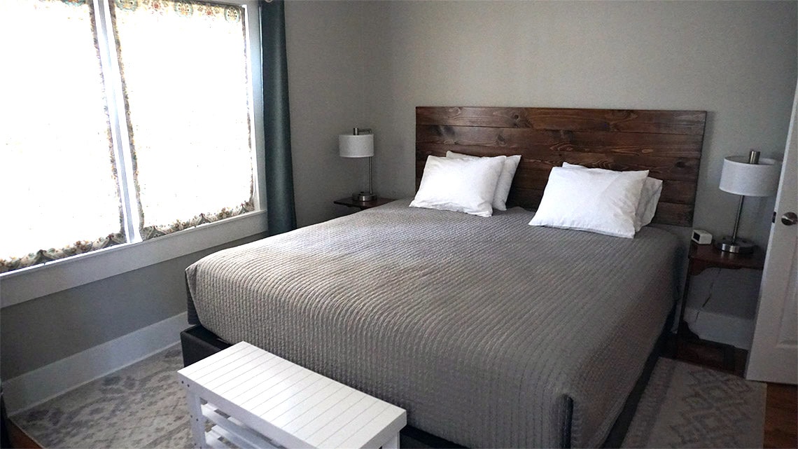 This unique suite has been restored to its 1935 historic ambiance. It has ample space for two or three people with one full size bed and a twin bed. We also have a rollaway bed and a cot that work well for children. The kitchen has a stove, small fridge & microwave. It is furnished with dishes and cookware. Enjoy your meal in the lovely dinette, just off the kitchen. Snuggle into the chaise lounge, turn on the electric fireplace and get comfy.